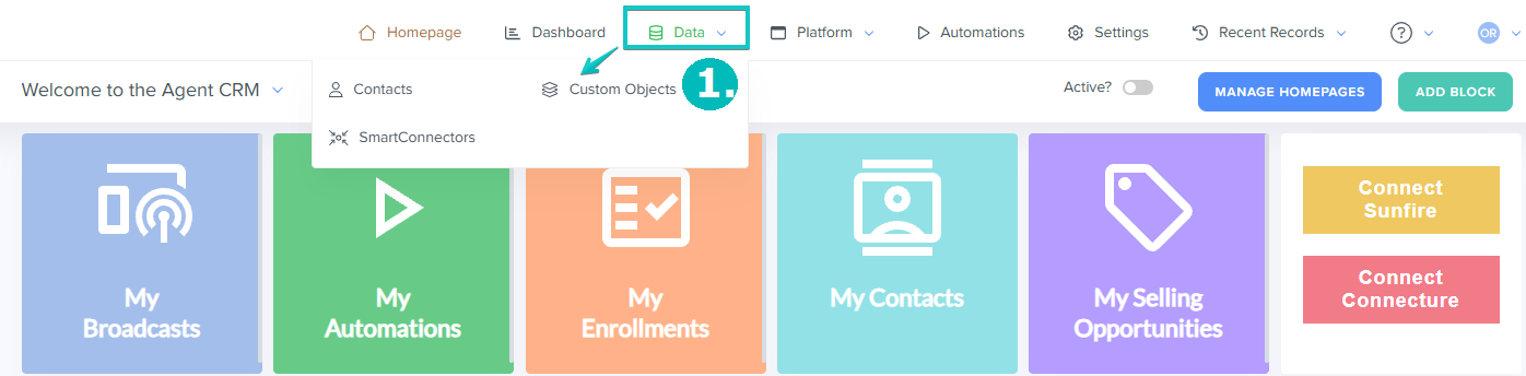 1. Navigate to the Contacts or Custom Objects section, located in the Data tab