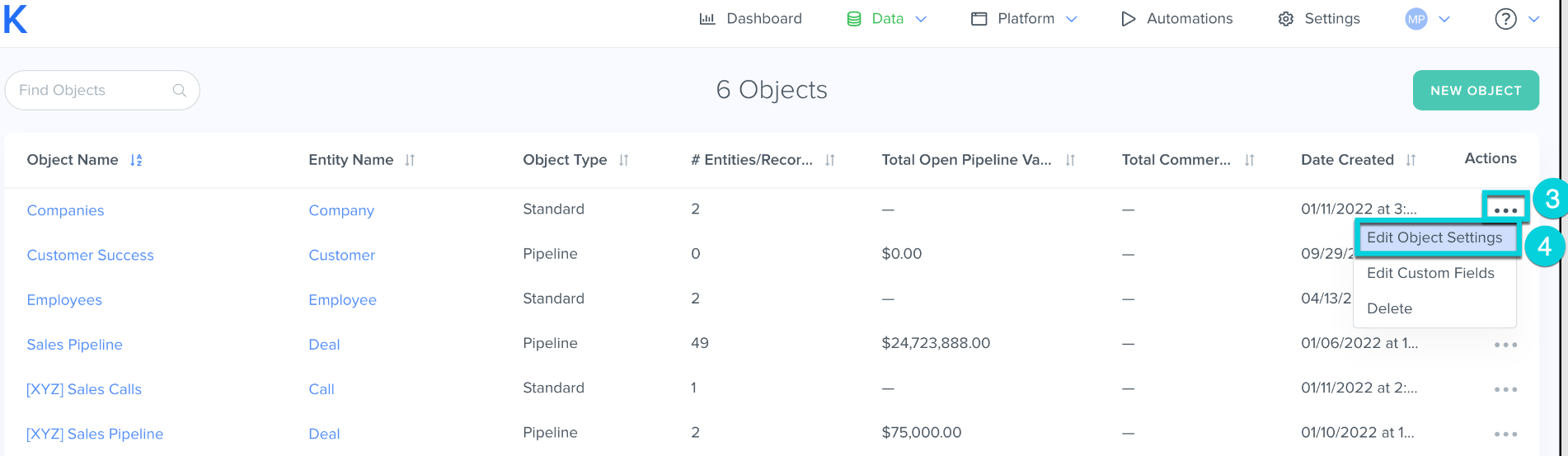 3. Click the "... " under Actions for the Sales Pipeline object