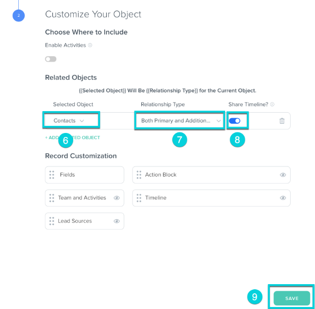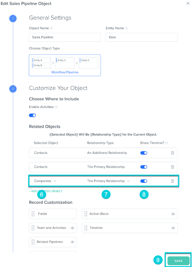 Hint: Follow the steps above using the Sales Pipeline object instead of the Companies object to setup this relationship. Once saved, the relationships between the Contact and the Sales Pipeline Objects will be established
