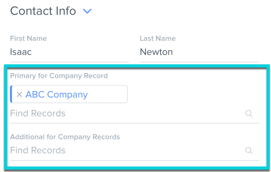 In this example let's look at Isaac Newton's contact record and ABC Company's company record. Isaac Newton is the Primary Contact for ABC Company.