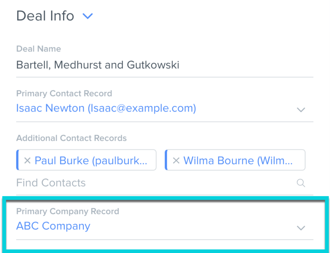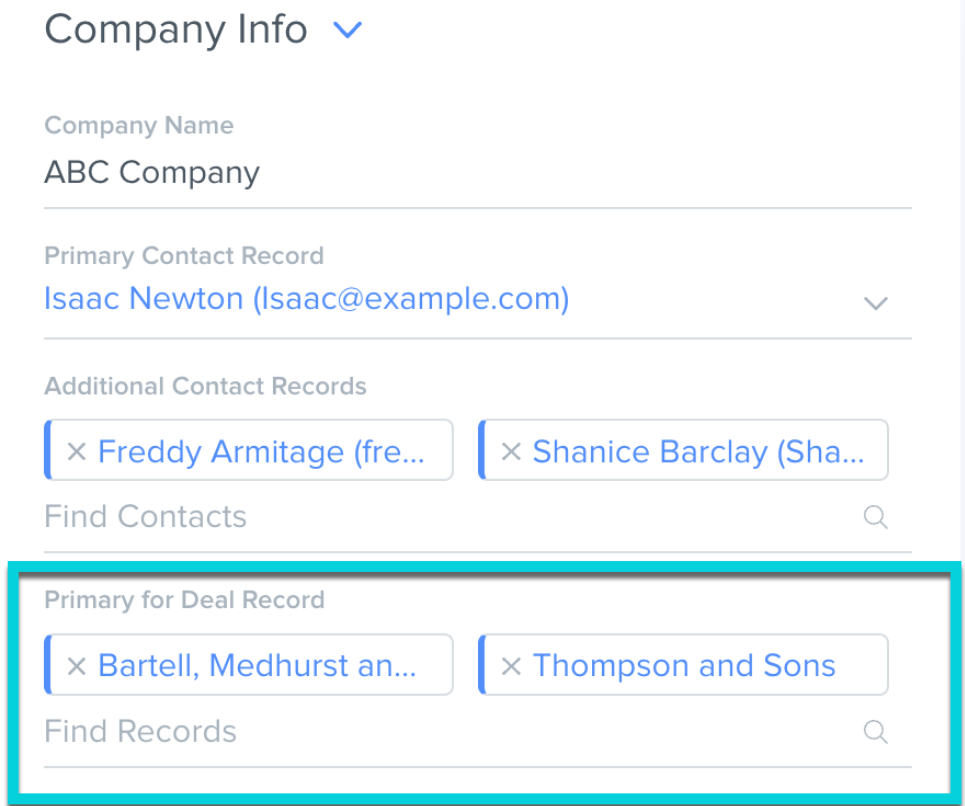 On the Contact record, there will be a Primary for Deals field and an Additional for Deals field. The Primary for Deal Record field is a one to many relationship type, meaning the Deal record can only have one primary contact, but the contact record can be a primary contact for many deals.
