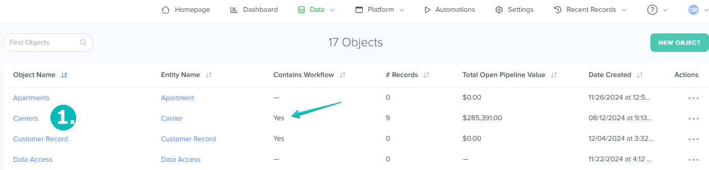 1. Click on a Custom Object that has Workflow/Pipeline set