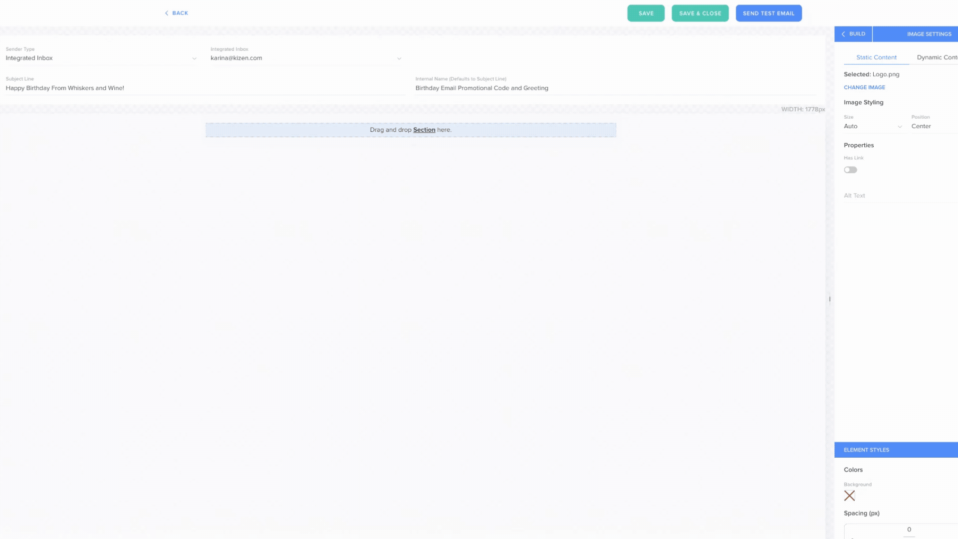 The Kizen email builder functions as a set of building blocks per section. You can use the existing template blocks to insert images and text, or you can delete the existing blocks and start from scratch.