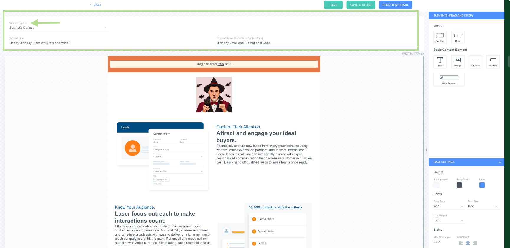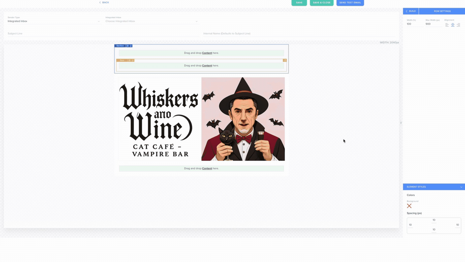 To create an email from scratch, drag and drop the elements from the menu pane on the right side of your screen to the email body.