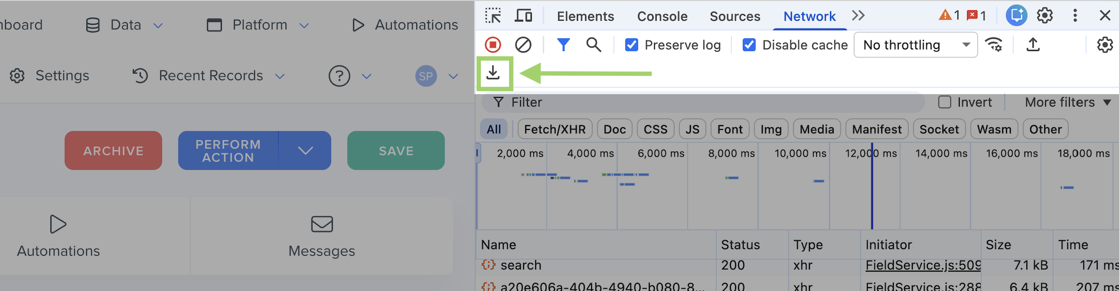 If you run into web performance issues (such as error messages, data not saving successfully, slow loading, etc.) in Kizen, and you've already tried basic troubleshooting steps, our Technical Support team may ask you to record network logs. Recording and downloading a HAR (HTTP Archive) file creates a log of all the network requests made by your browser as you recreate the issue. This is super useful for our team to investigate, diagnose, and resolve the behavior you are experiencing.