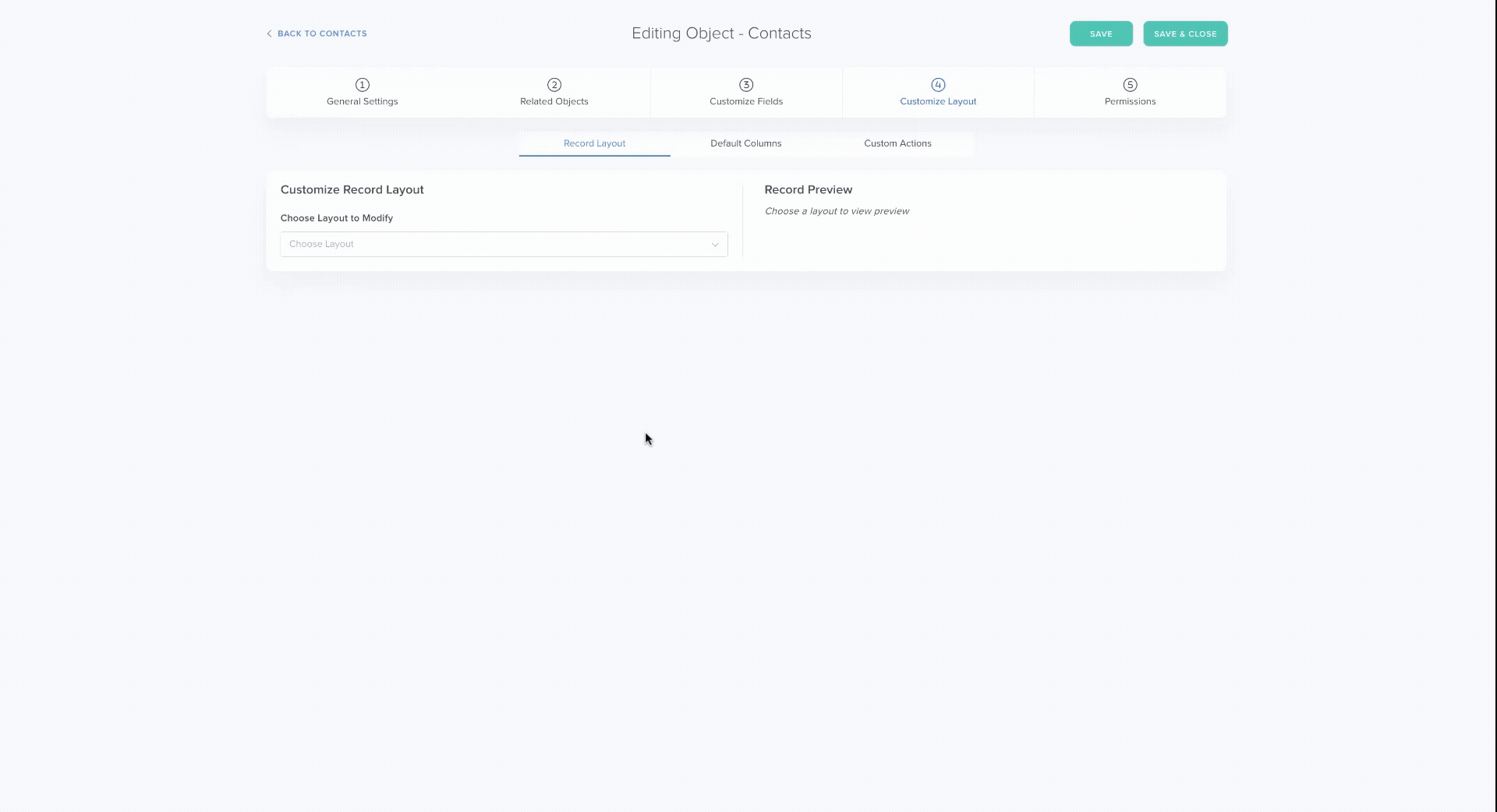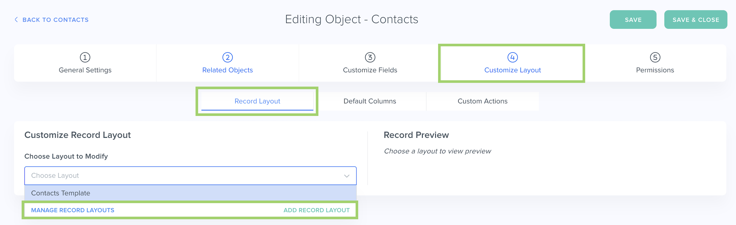 - Click on either "Manage Record Layouts" to duplicate the pre-built Contacts Template and customize it to your preferences, or "Add Record Layout" to create a completely new record layout from scratch.