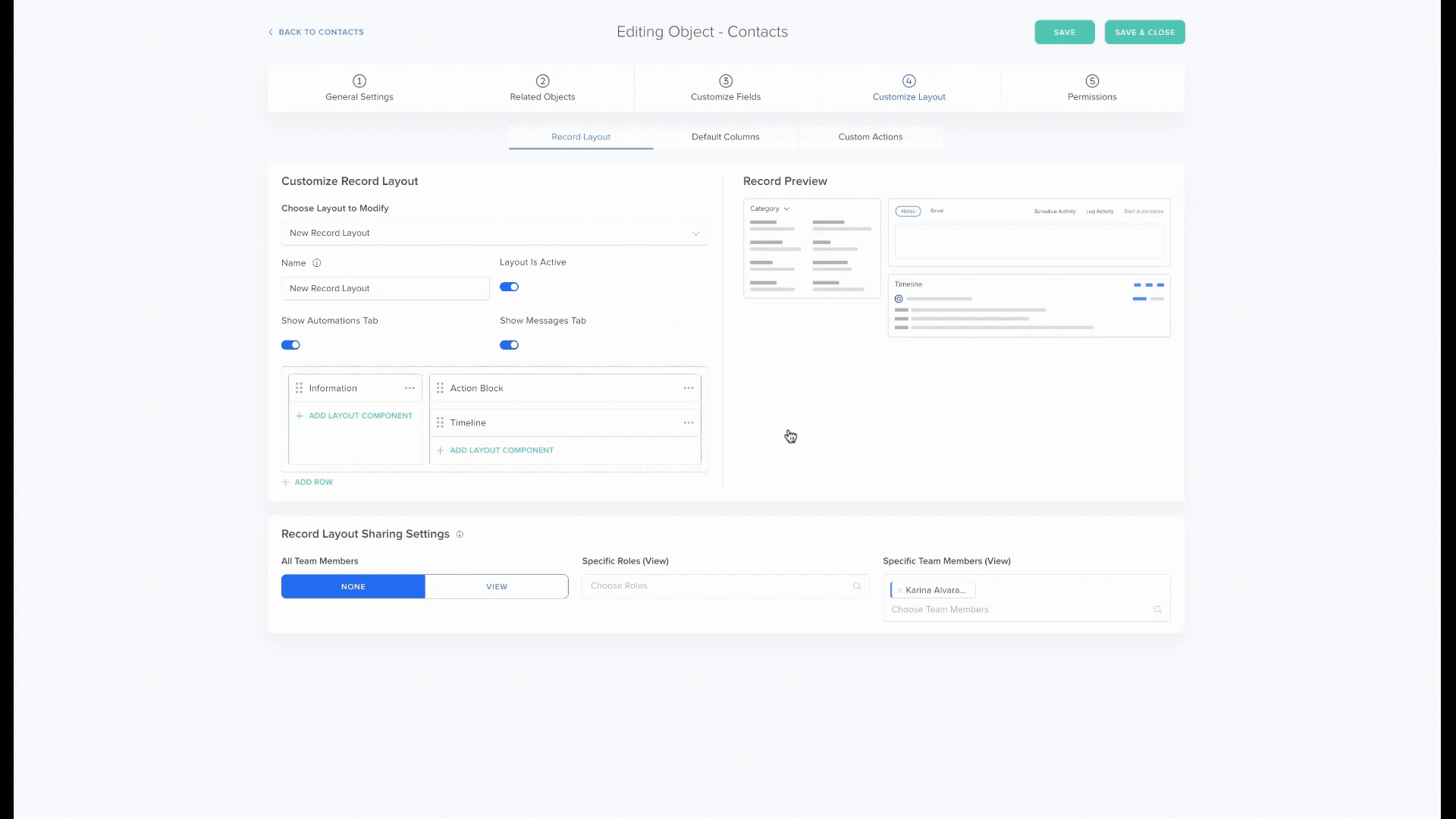 Once you create your new record layout, you'll see the menu to add and rearrange your layout components on the left. On the right, you'll see the Record preview to see what your final layout will look like.