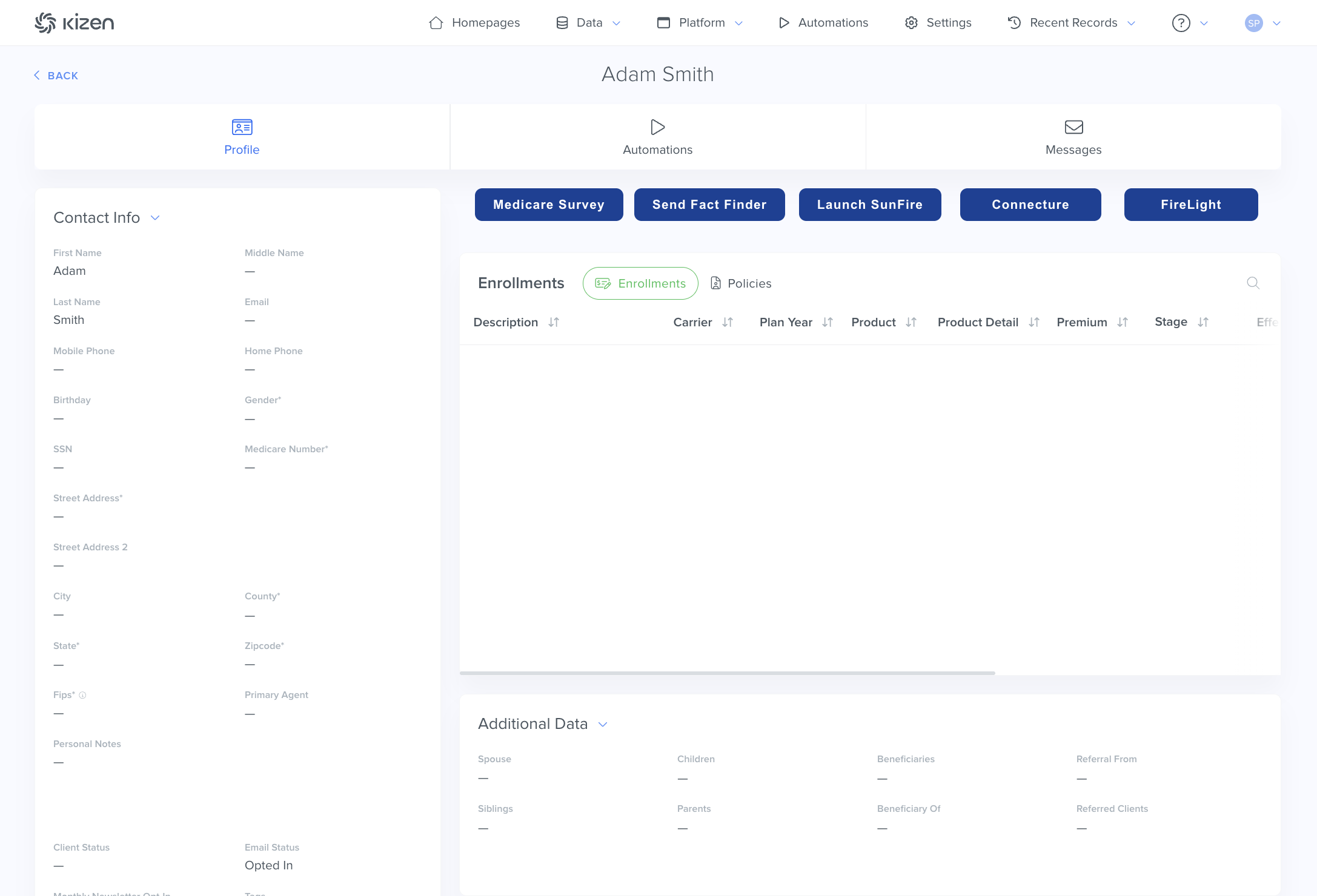 The Agent CRM comes with pre-loaded record layout templates that are designed specifically for your insurance agent needs. For example, the Contact Record Layout display your most relevant fields and related objects such as Enrollments and Policies, as well as action buttons to trigger pre-built automations and integrations with a single click.