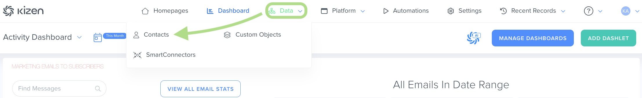 - To test your new record layout, click on "Data" in the top menu bar > "Contacts" > Select any Contact.