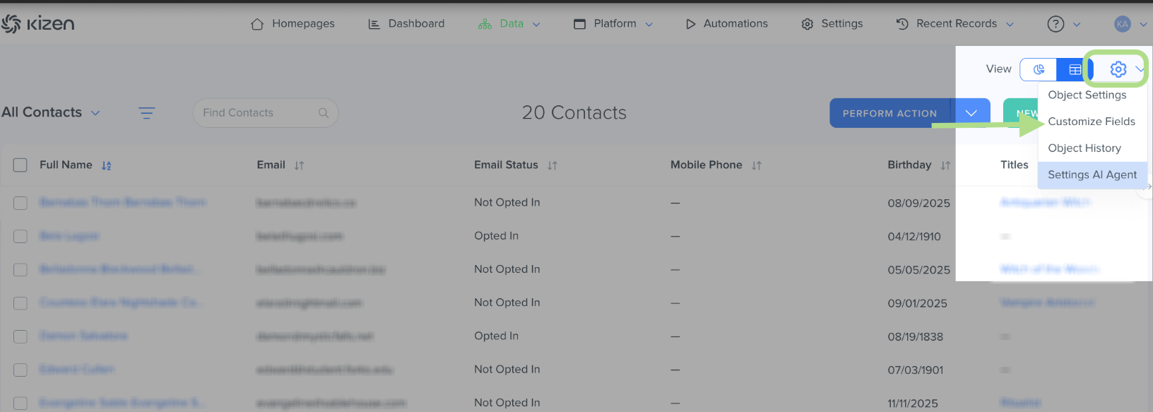 - On the Contacts page, click on the gear icon on the upper right and select "Object Settings" in the dropdown menu.