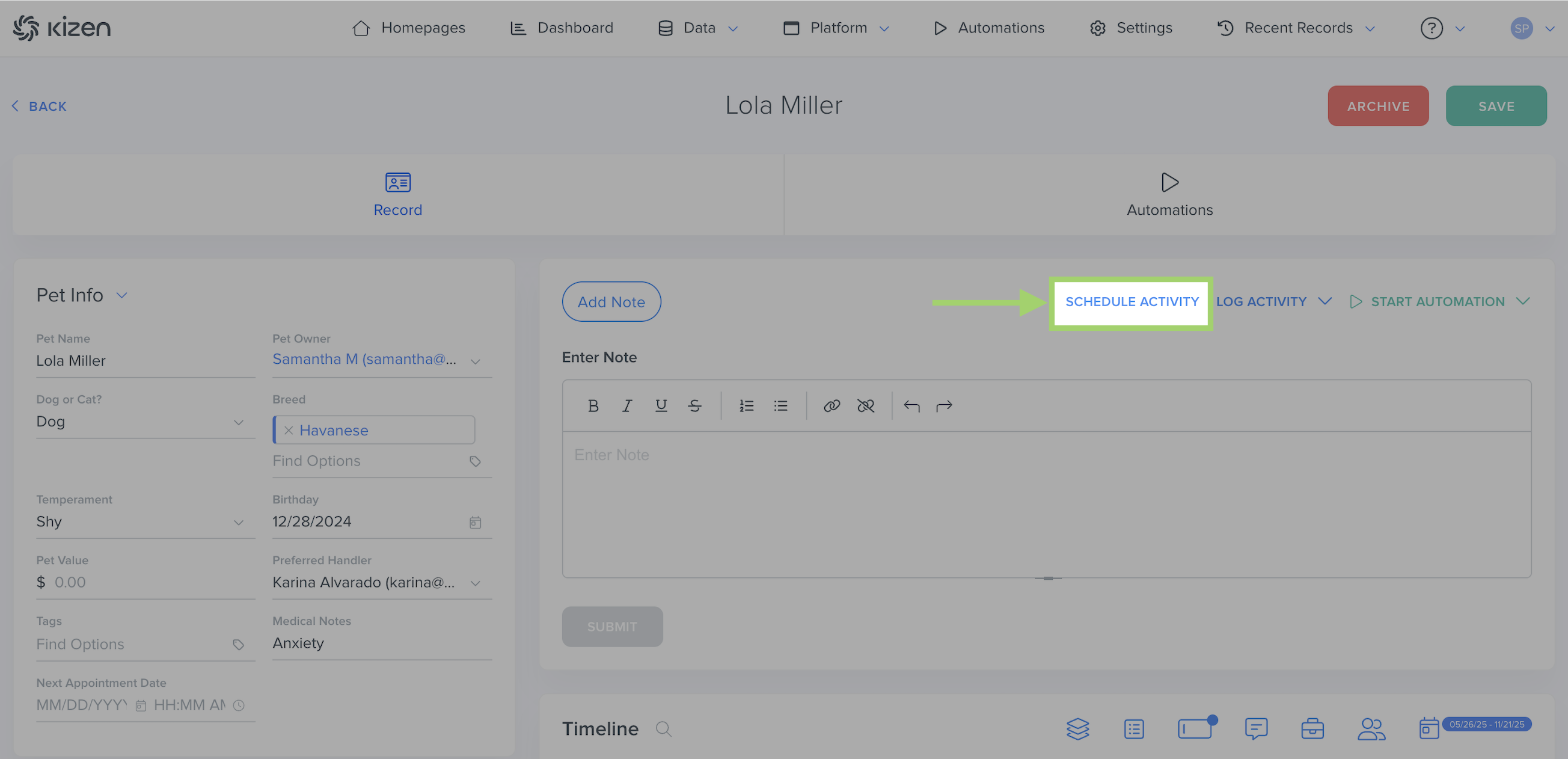 - Click on the "Schedule" button. This appointment request will then show up on the pet's record Timeline, as well as the client's Timeline.