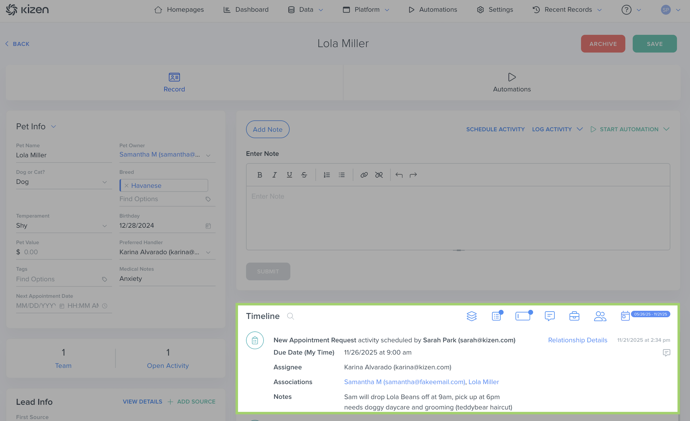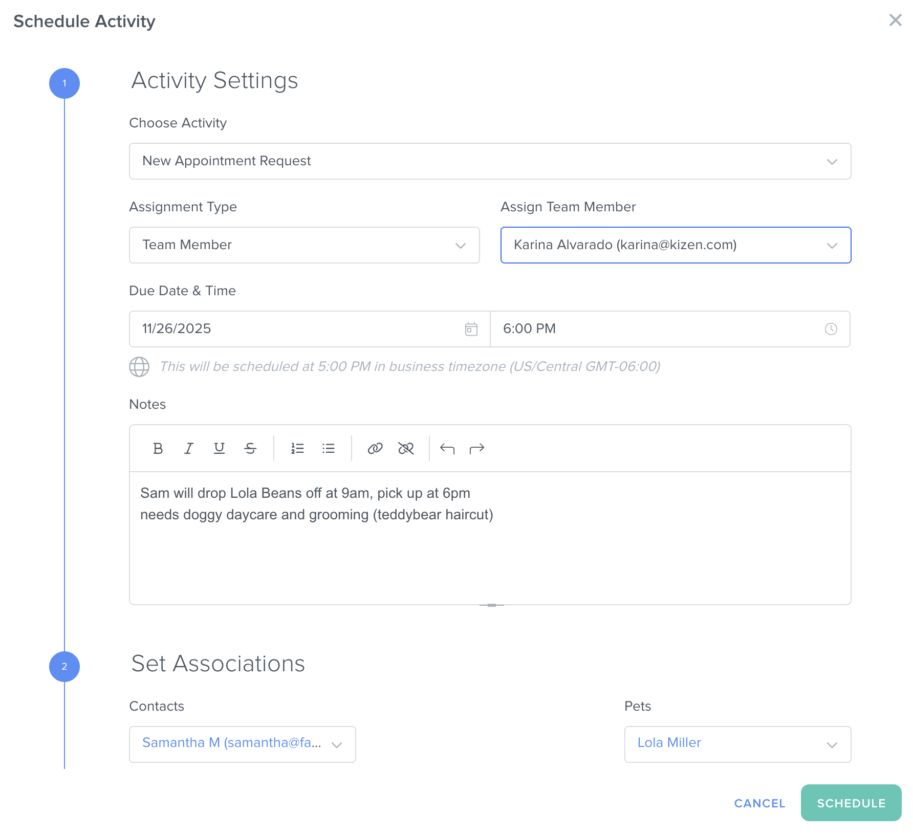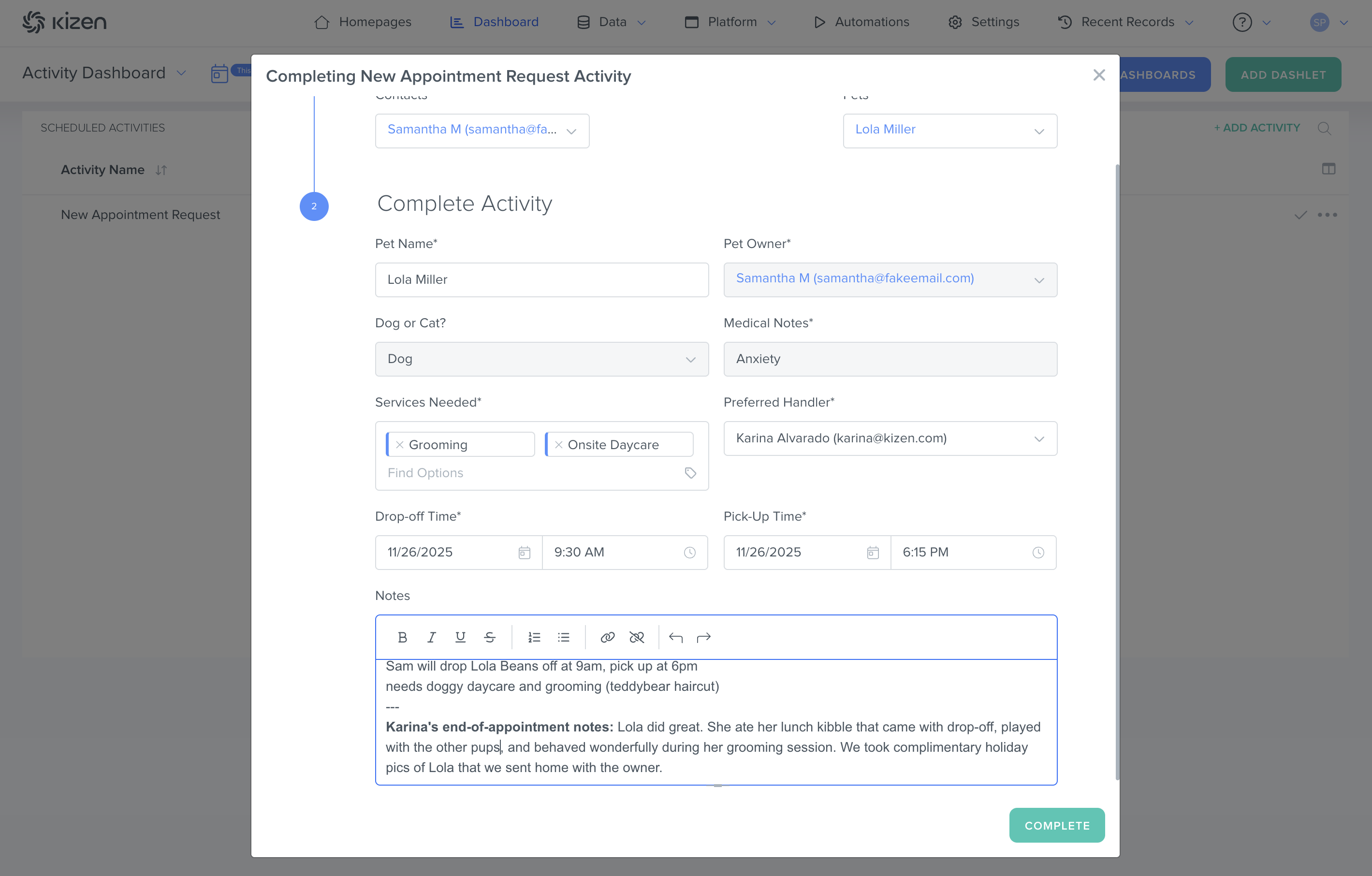 - Choose "New Appointment Request" as the Activity type, assign the relevant staff member, add the pick-up time in the "Due Date & Time" field, and add notes about Lola's service needs.