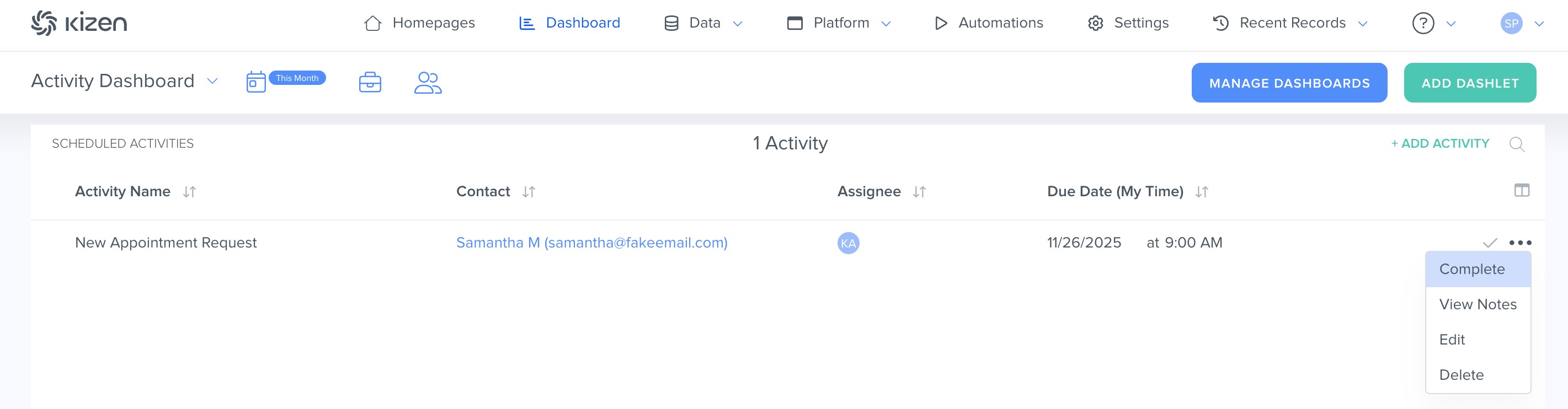 When you and/or your team log an Activity, you can choose to push the Activity field values back to your object record fields. You can also pair Activities with Kizen's Automations in order to automatically trigger workflows and even create new Activities for follow-up tasks. You can then visualize your team's Scheduled Activities on your Activities Dashboard to ensure collaboration and accountability.