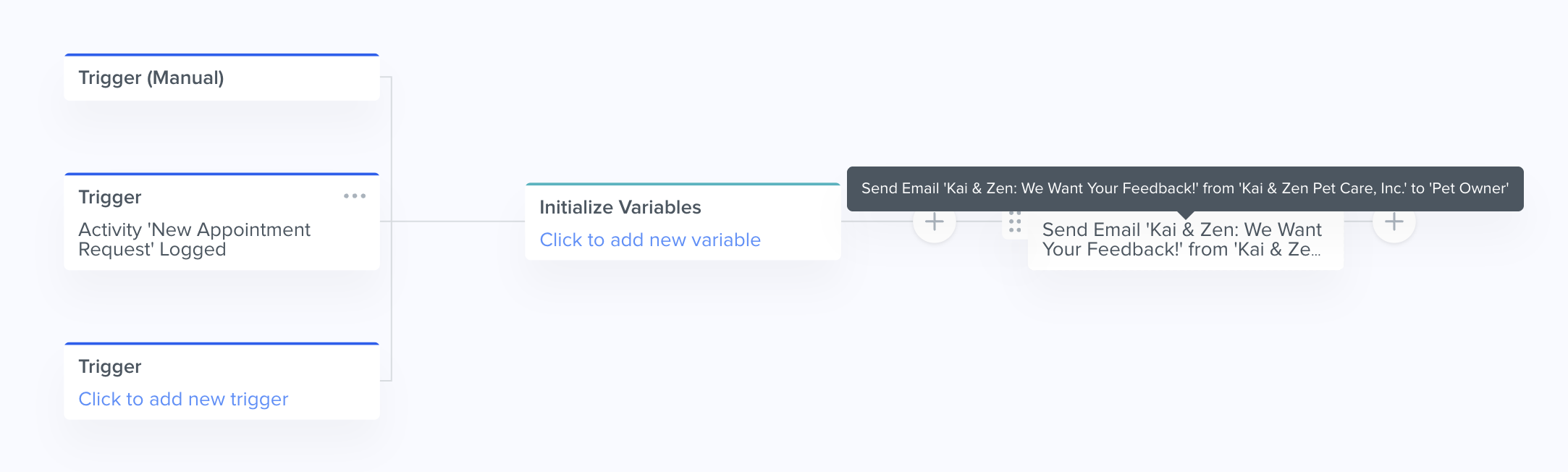 - Once the Activity is completed, this can trigger the following automation to automatically send a feedback survey email to the client.