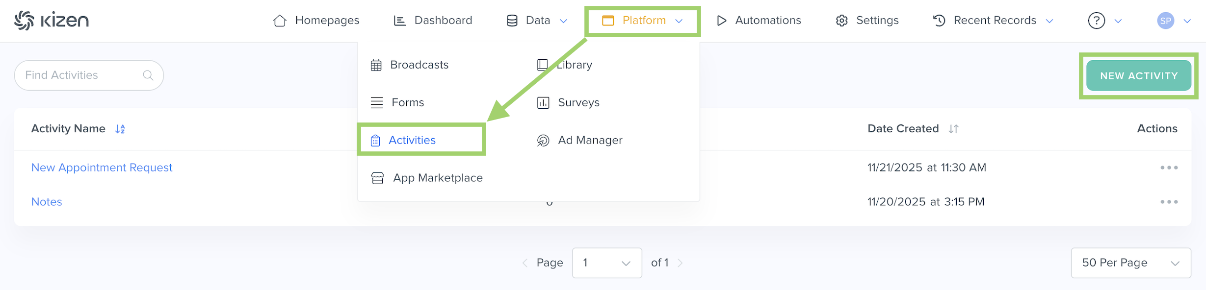 - Click on "Platform" in the top menu bar > "Activities."