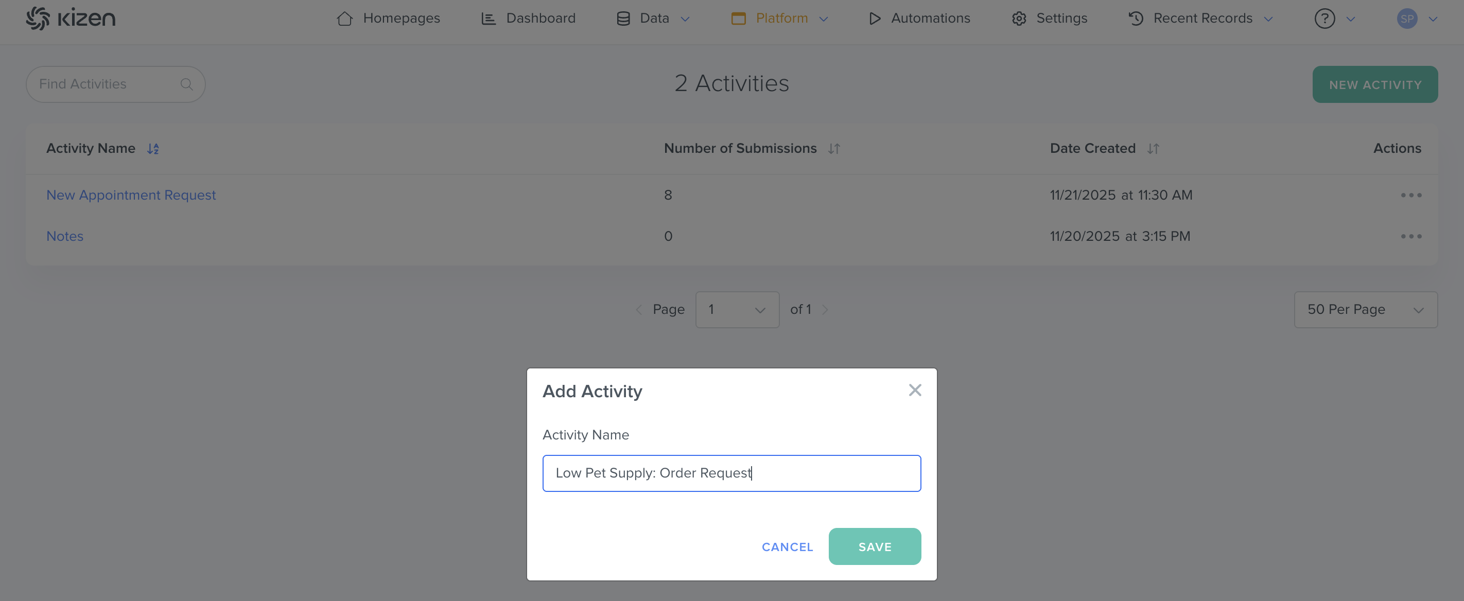 - In the pop-up window, add the Activity Name. (For our use case, we are naming this Activity "Low Pet Supply: Order Request.")