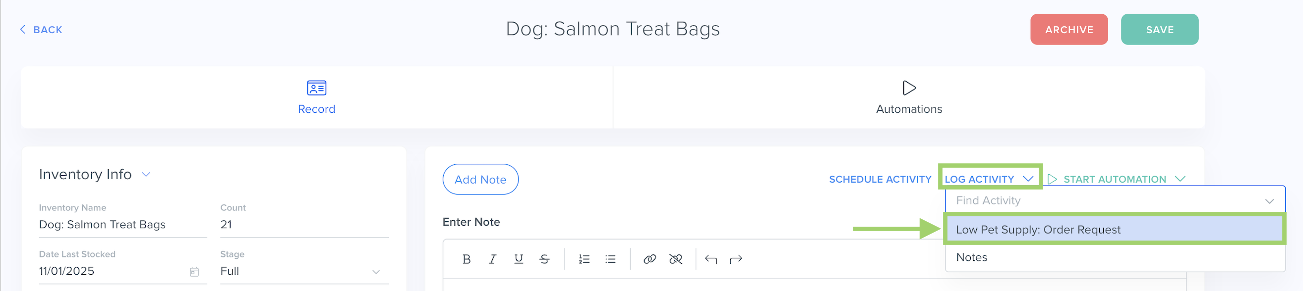 For our example use case below, we are a pet care business and we want to create an Activity to help our staff members submit order requests directly on specific inventory items.