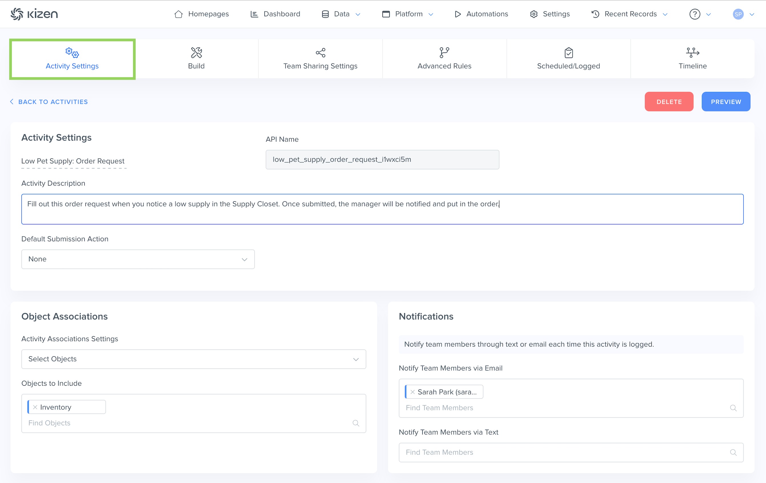 - Select Objects: You can choose to only display this Activity option in a specific Object(s). For our example use case, we only want to display the "Low Pet Supply: Order Request" Activity on the Inventory object.