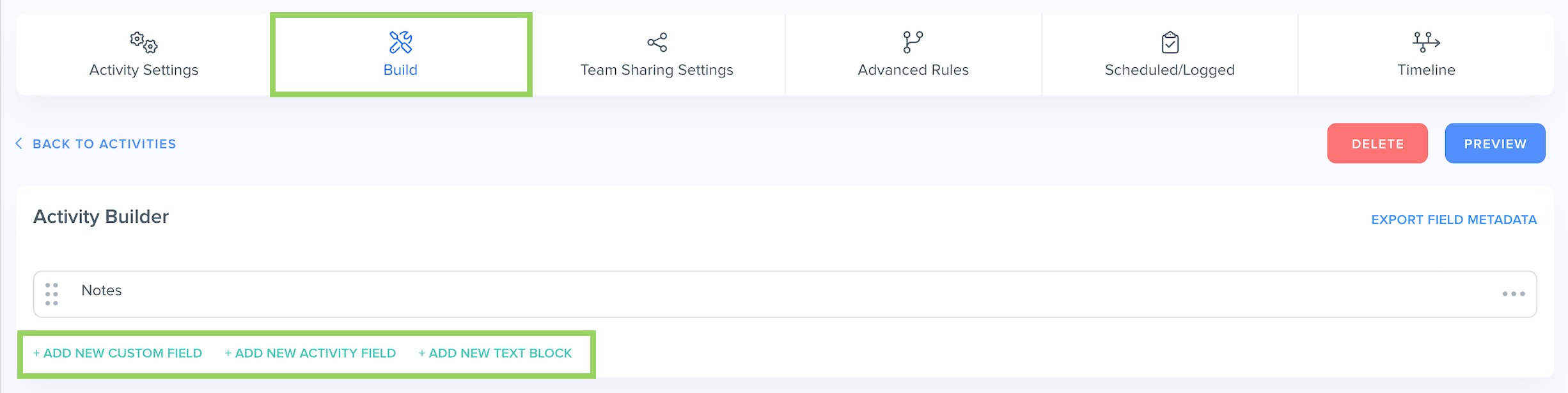 When you're done with your Activity Settings, click on "Build" in the Activity menu to start adding the components of your Activity. By default, the Activity Builder comes with a Notes field. You can also add Custom Fields, Activity fields, or Text Blocks.