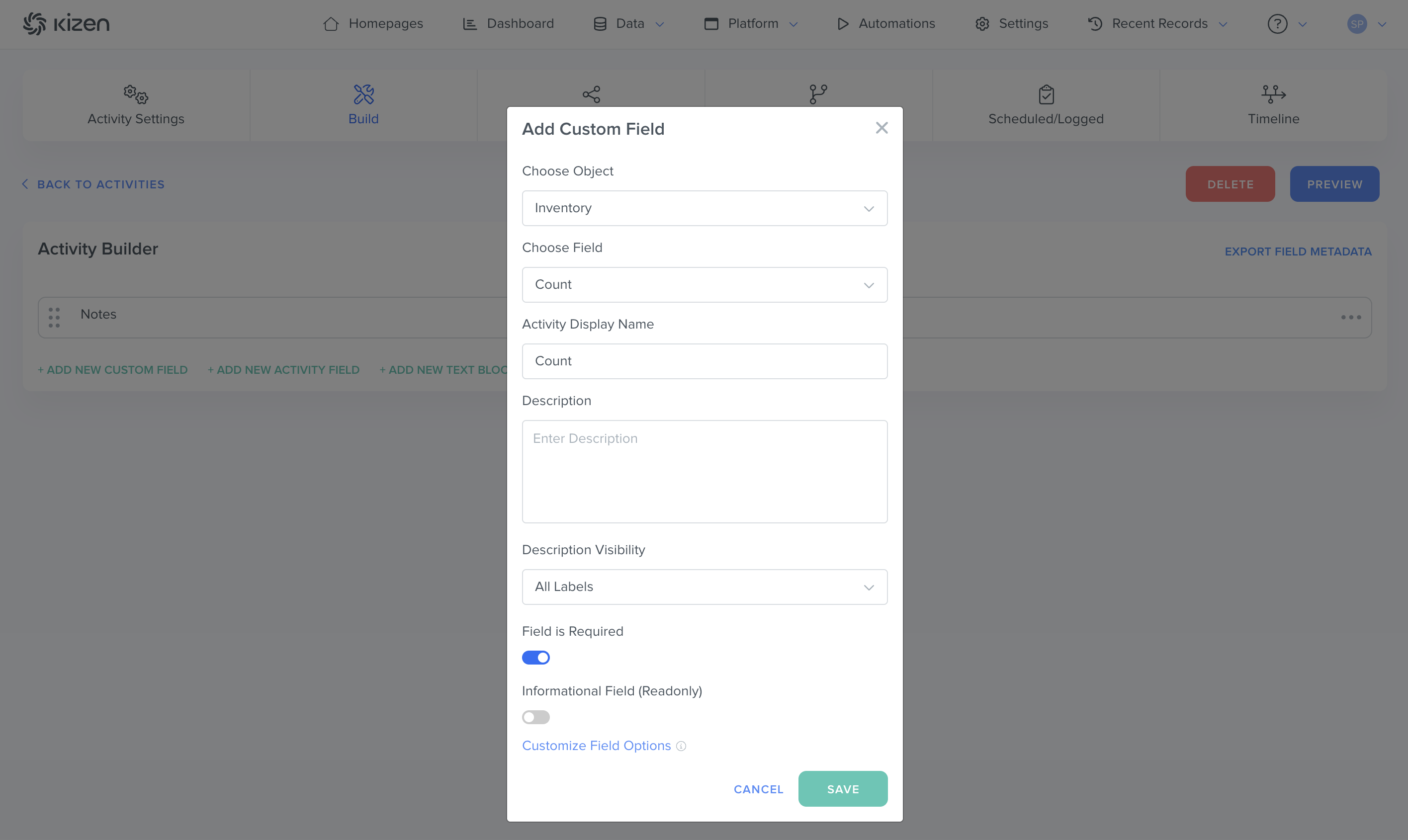 - Toggle "Informational Field (Read-only)" if you only want to display the field data for the specific Object record and prevent team members from editing the field via the Activity.