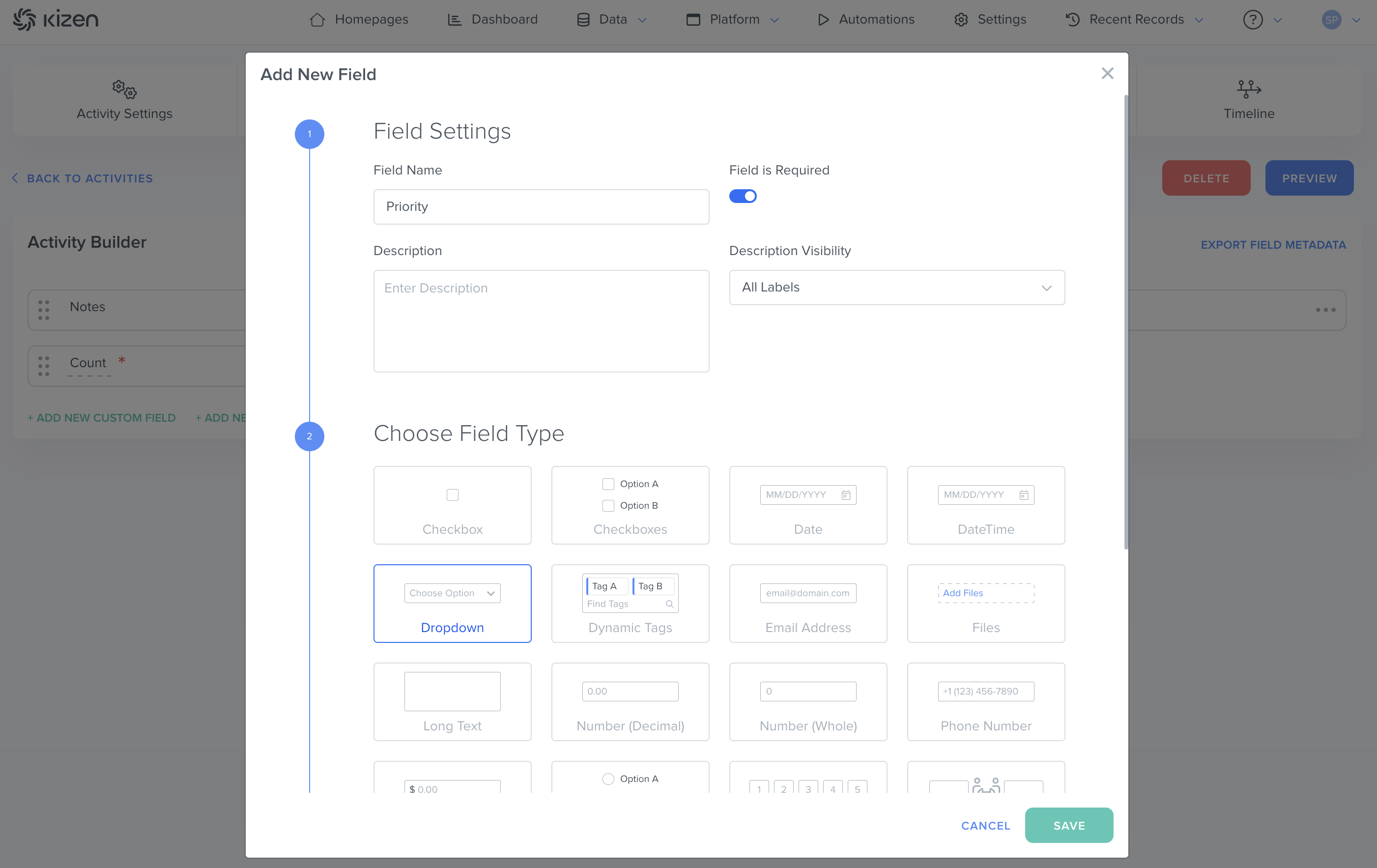 - Choose the Custom Field or Activity Field.