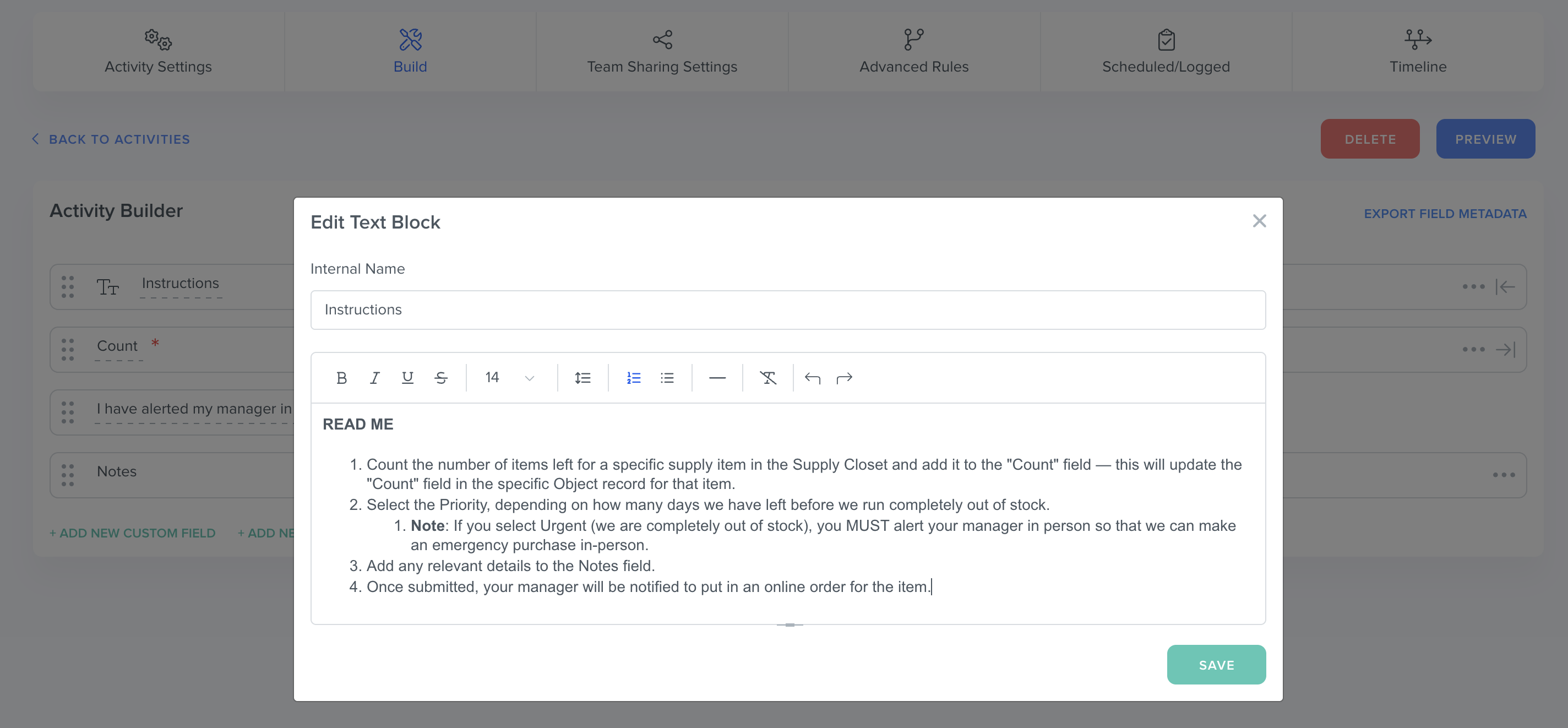 For example, we're adding a "Priority" Activity Field — we don't need to display the priority of a specific supply request in a Custom Field on the item record itself, but it's useful for the manager receiving the request to know.