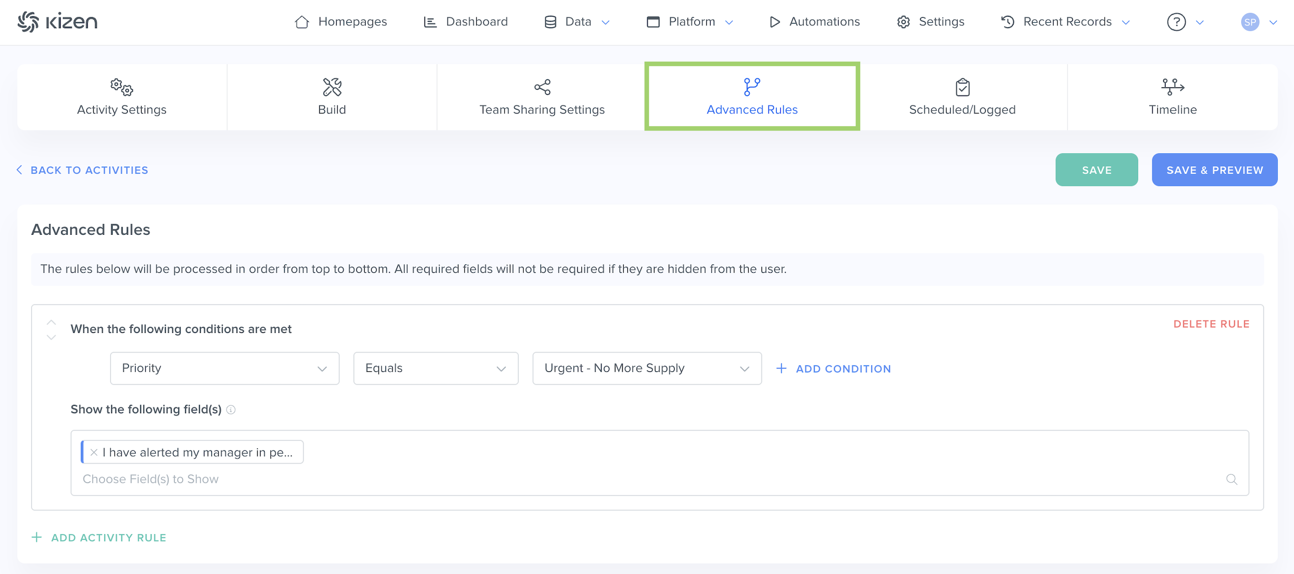 You can also set up advanced rules for your Activity that will display specific fields depending on certain conditions. These rules will be processed in order from top to bottom.