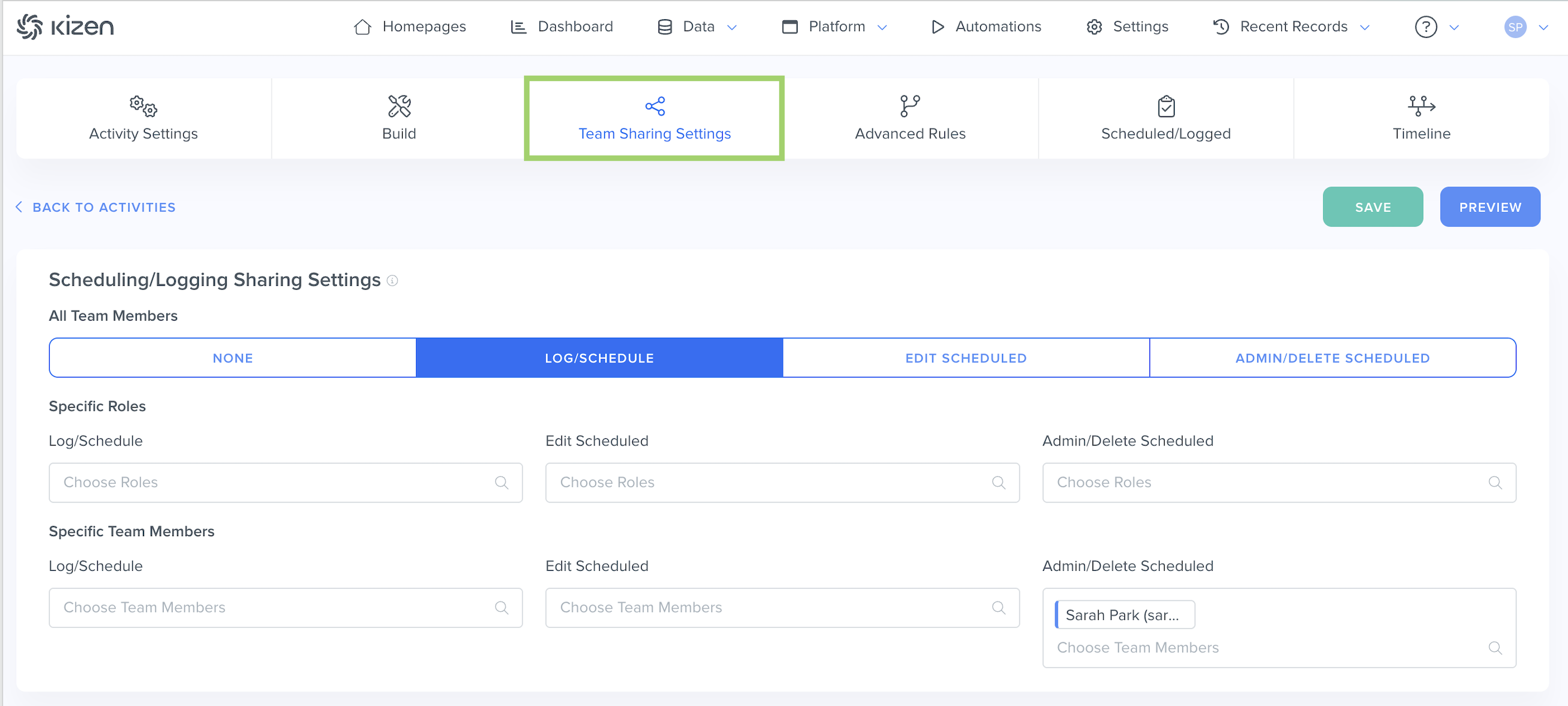 - To get more granular with your Activity sharing settings, choose which specific roles and which specific team members can log and schedule this Activity, edit Scheduled Activities, and edit the Activity itself/delete Scheduled Activities.