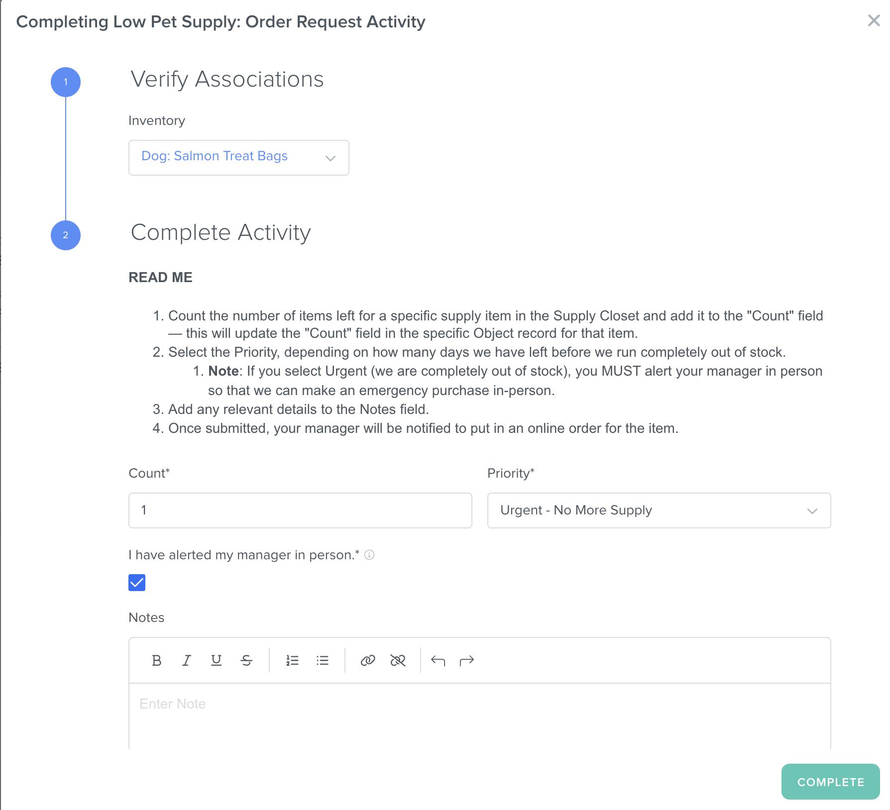 For our "Low Pet Supply: Order Request" Activity, we want to require the "Count" field in the "Inventory" Object, but we do not want it to be read-only because we want our staff members to count the remaining number of items and add that number when filling out this request.