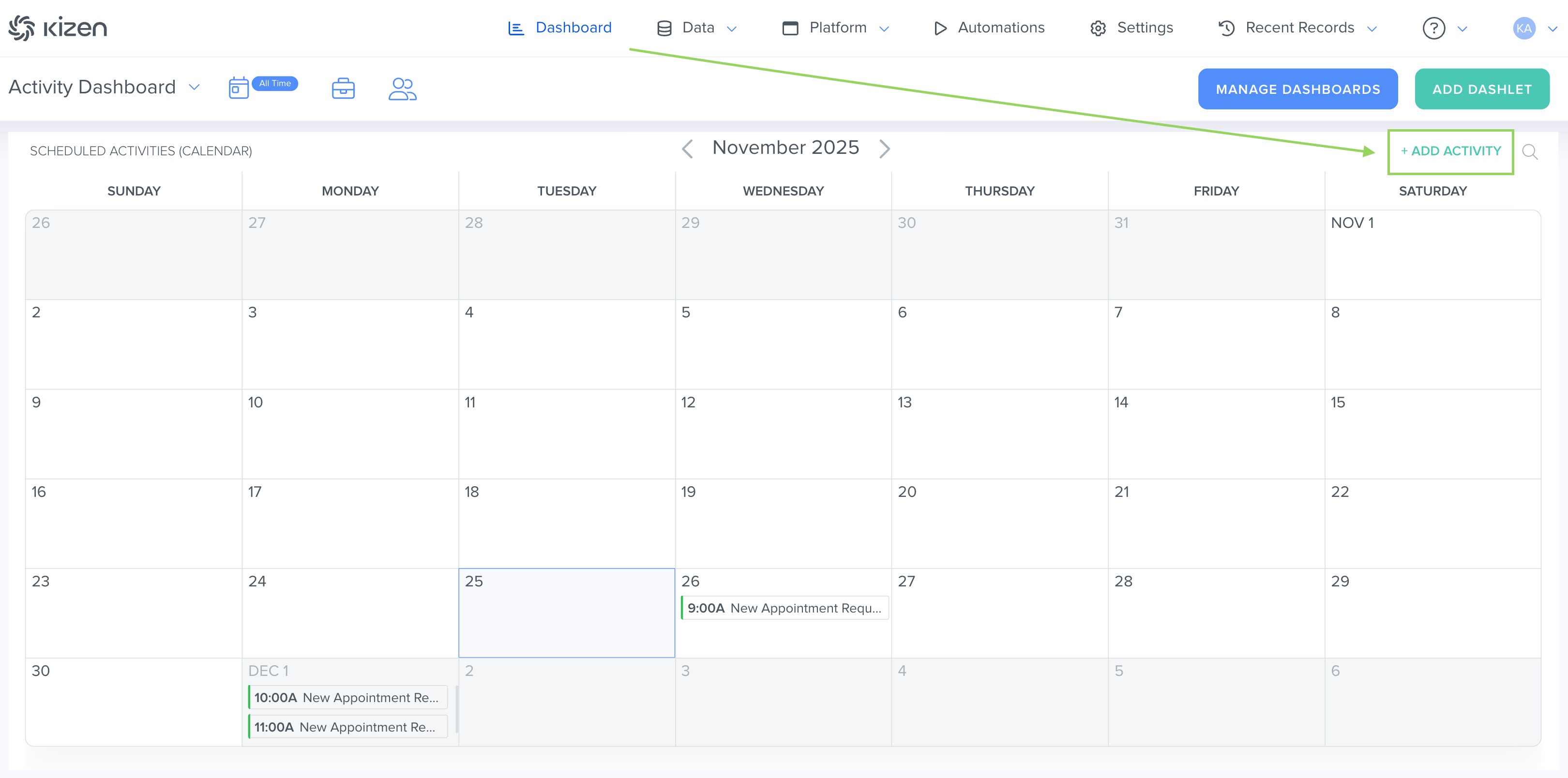 - From Your Activity Dashboard: Click on "Dashboard" in the top menu bar, and in your Activity Dashboard, click on the "Add Activity" button in the top right corner of your Scheduled Activity Dashlet.