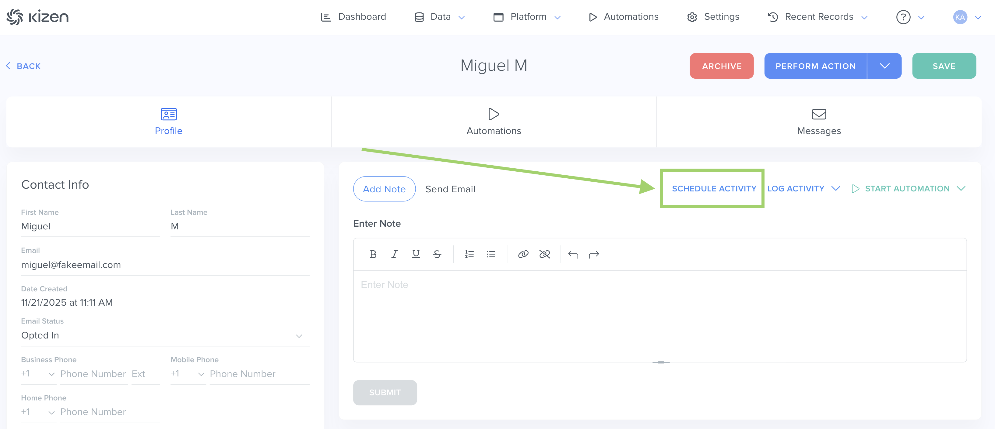 Tip: You can easily schedule an Activity from three different places: from the Activity Dashboard, a Contact record, or an automation.