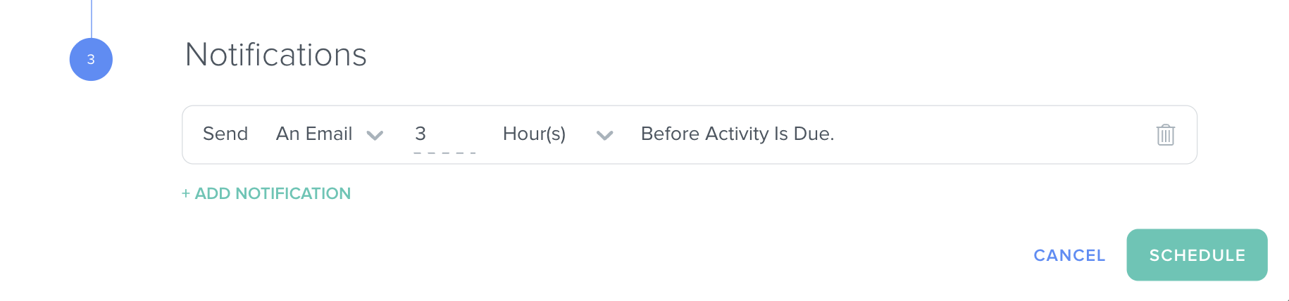 - Select how many minutes, hours, or days before the Activity the team member should be notified.