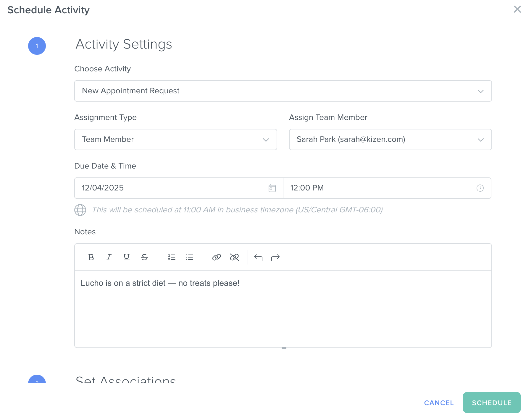 ⚠️ Attention: Make sure you have already set up Activities before this step or you will only see the default "Notes" Activity. - Choose a team member to assign to the Activity. This is the team member who will receive the notification for the Scheduled Activity and will be expected to complete the task. For our pet appointment example, we might be assigning the client's preferred staff member to groom the pet, walk the dog, feed the cat, etc.