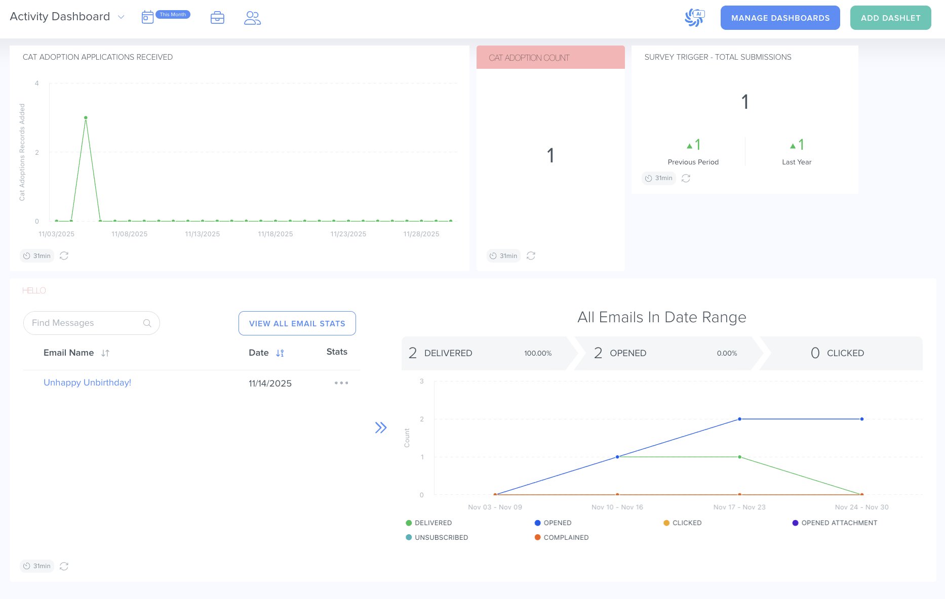 Another default Dashboard is the "Email Marketing Hub." It gives you a complete picture of how your email campaigns are performing. You'll see key email deliverability metrics like delivery success rates, how many clients have opted out, complaint numbers, and other important engagement data. This helps you quickly understand what's working and spot any issues that need attention.