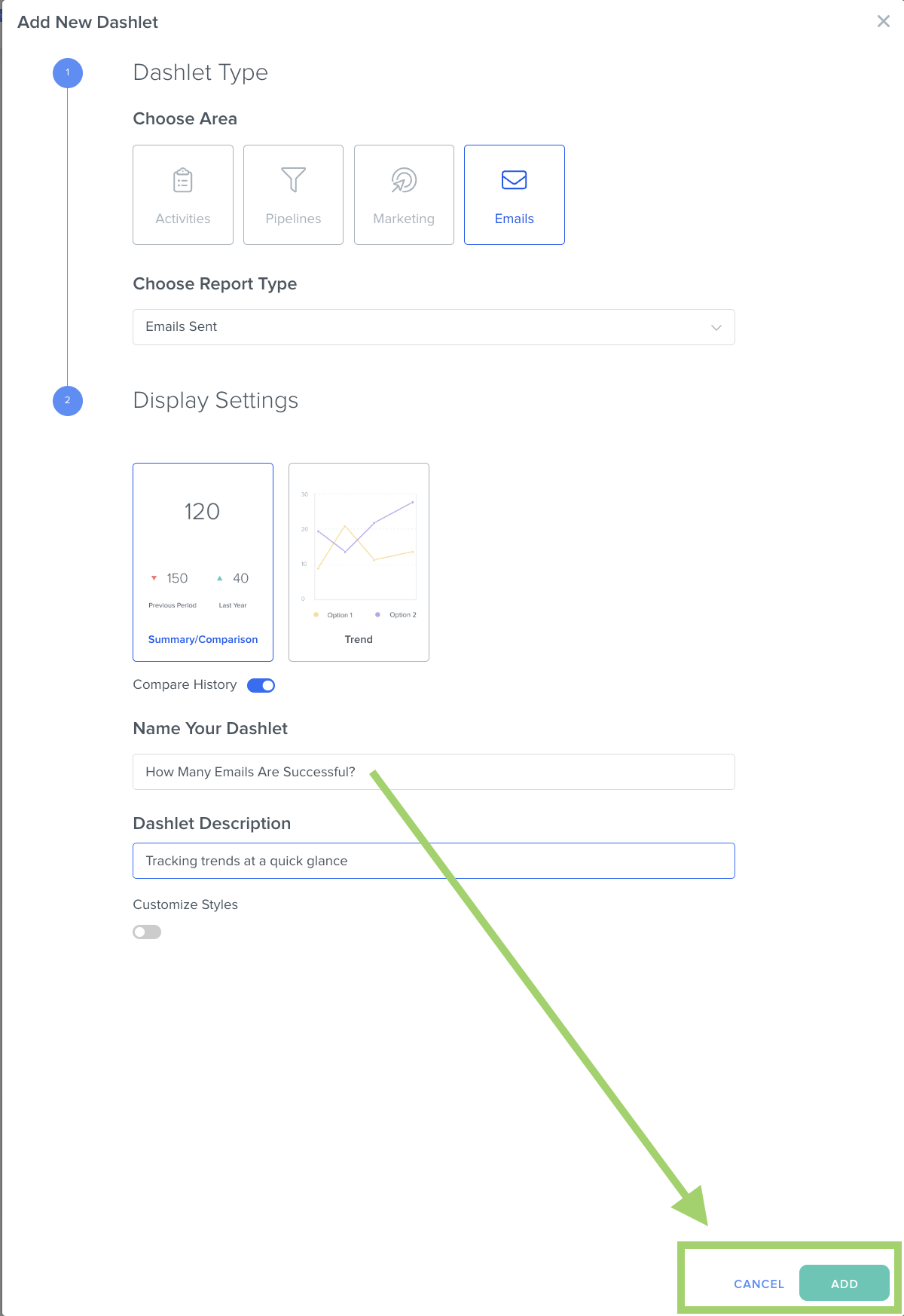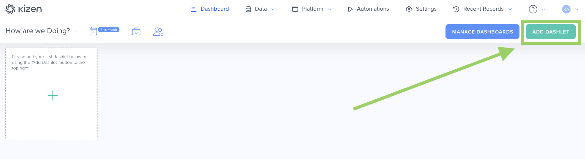 1. On your Dashboard, click on the green "Add Dashlet" button at the top right.