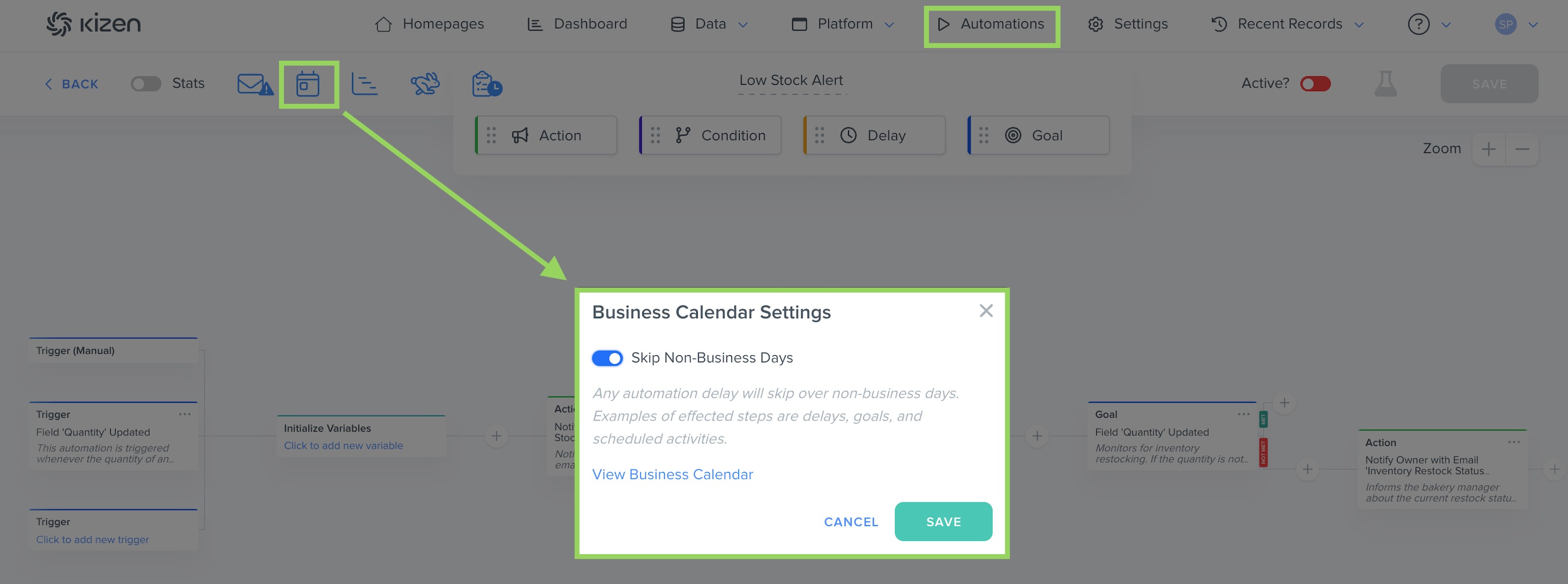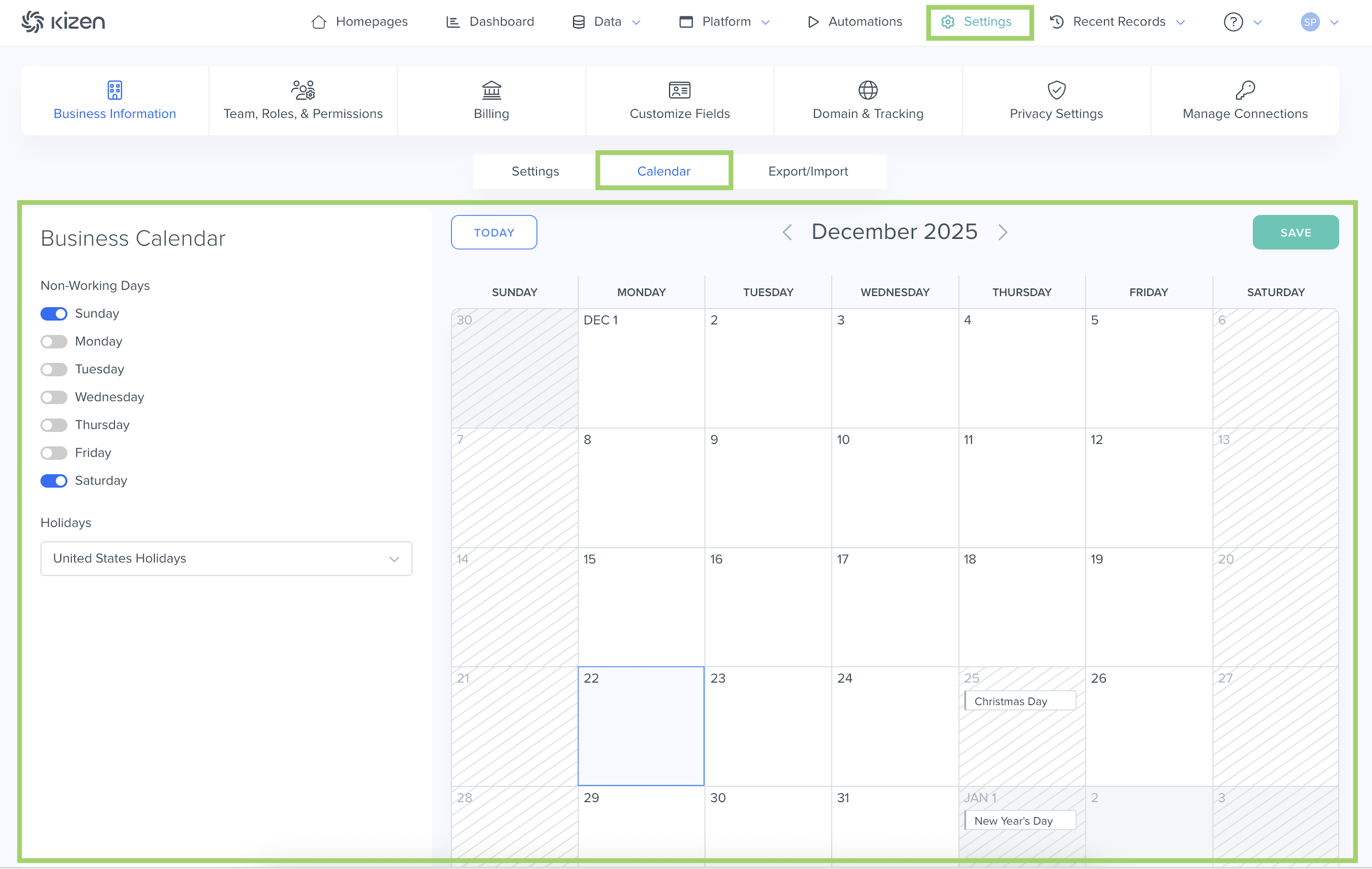 Purpose: Learn how to customize your Kizen account's Business Calendar by setting non-working days for accurate and efficient Automations.