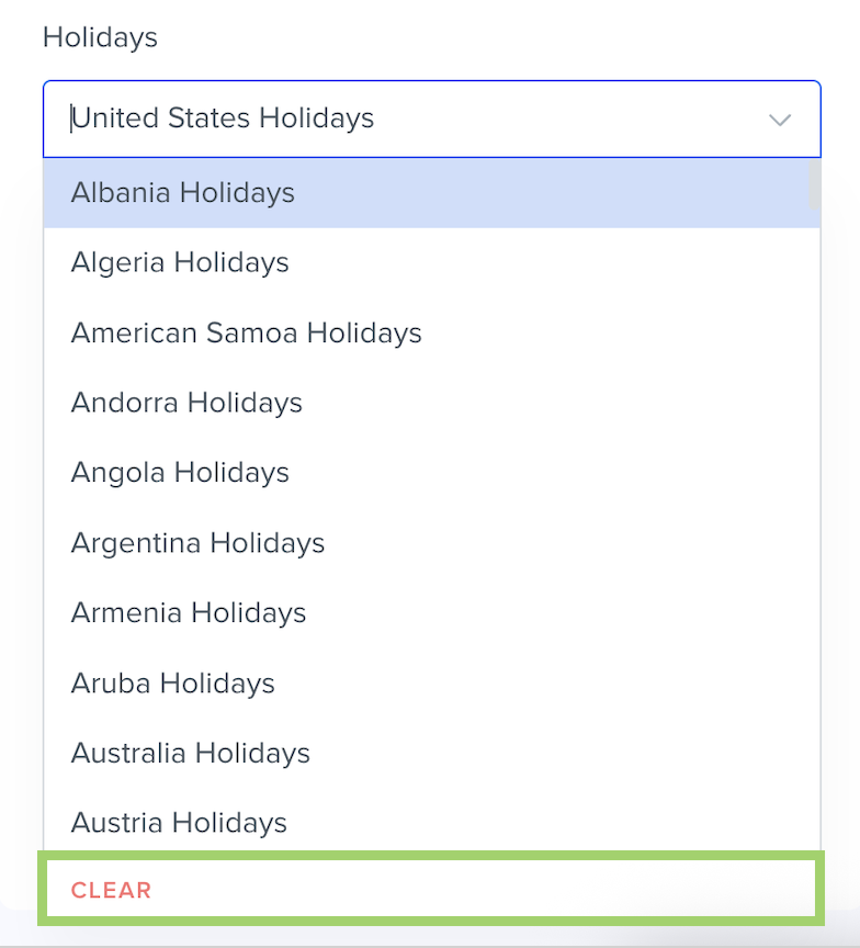To remove your "Holidays" setting, click on the red "Clear" button at the bottom of the dropdown menu.