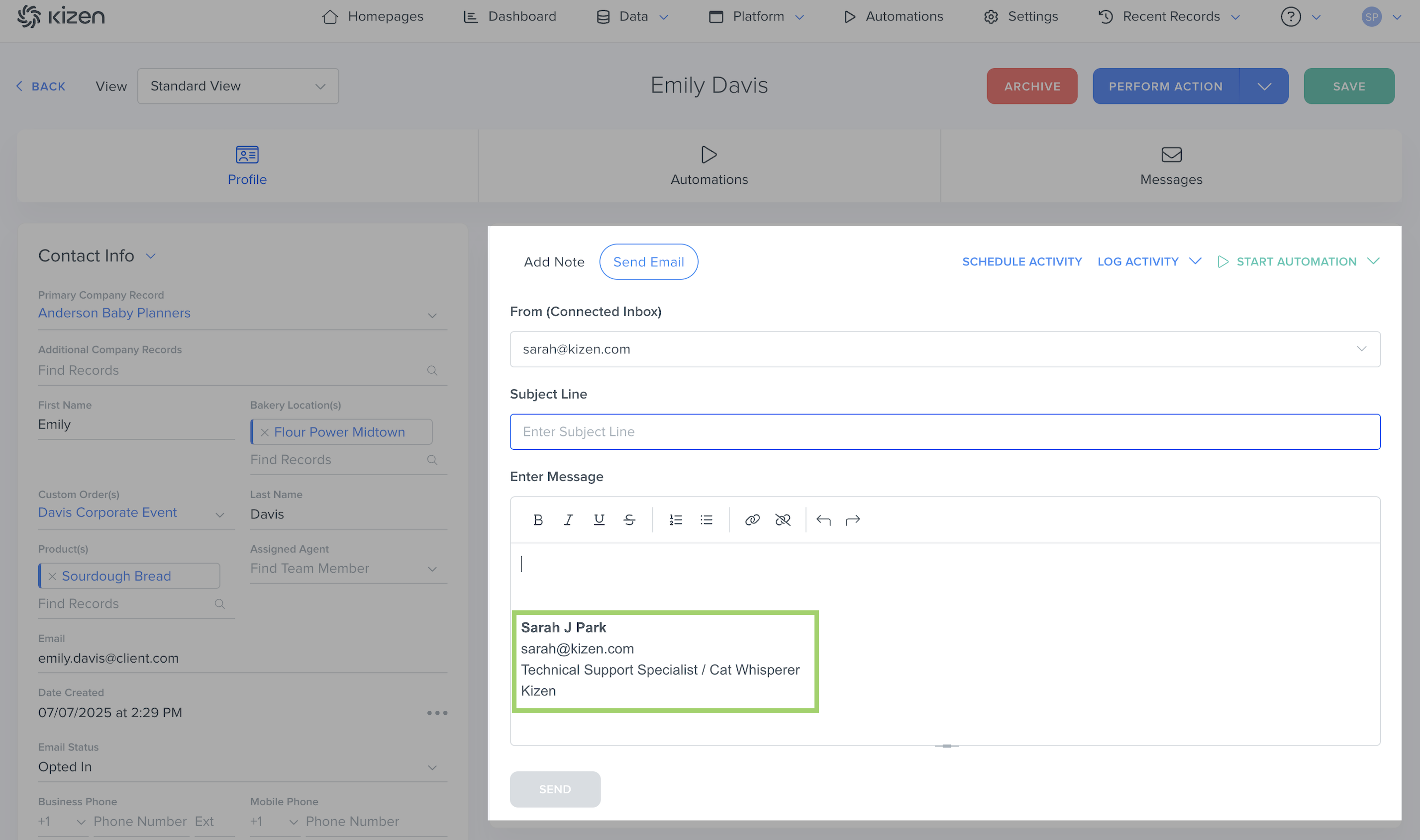 Purpose: Learn how to create a custom email signature to automatically populate in emails that you send directly from your Contact records in Kizen.