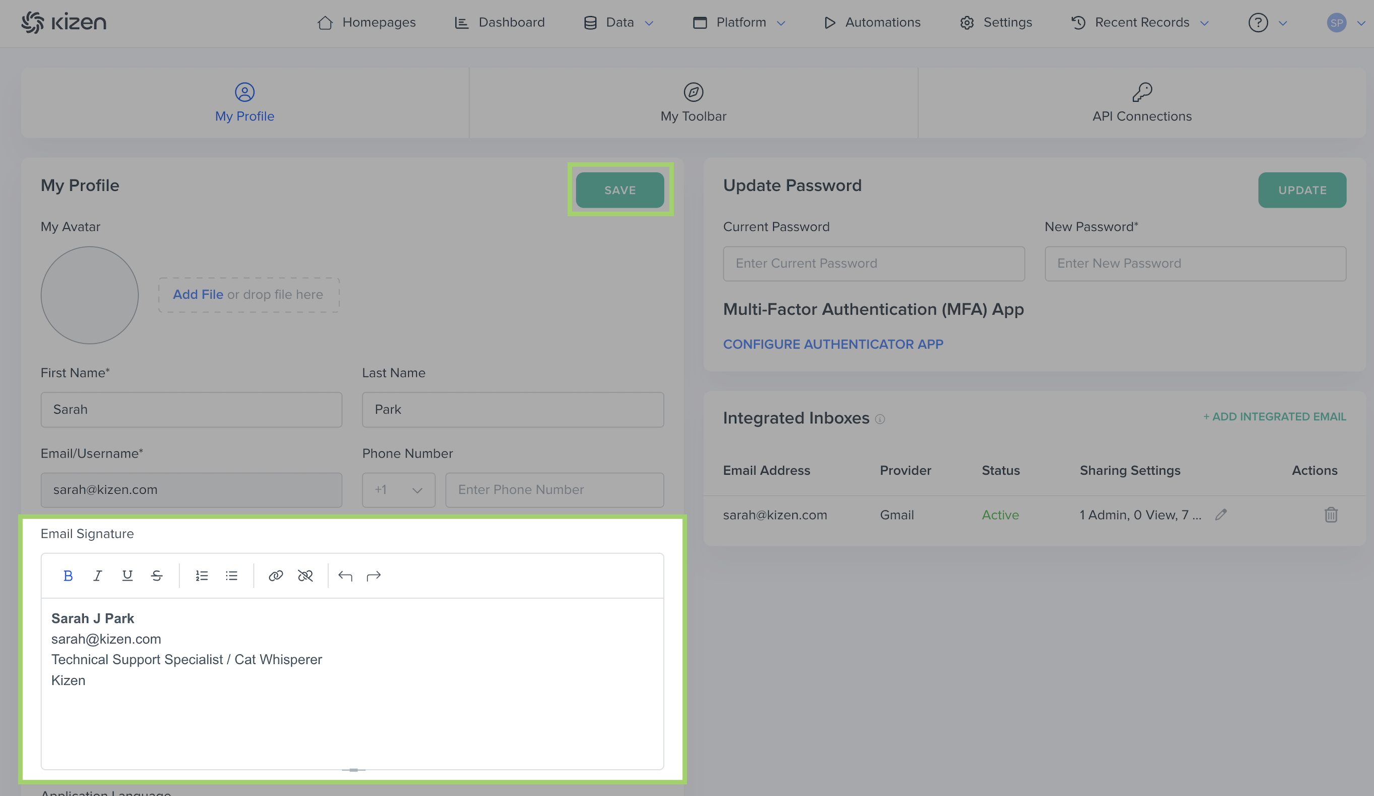 In Kizen, you can easily personalize the emails you send from the platform with a custom email signature. Once you connect your email address, just add your full name, title, contact information, and any relevant website links to the My Profile section. This will then automatically populate in every email you send directly from any Contact record, saving you time and energy!