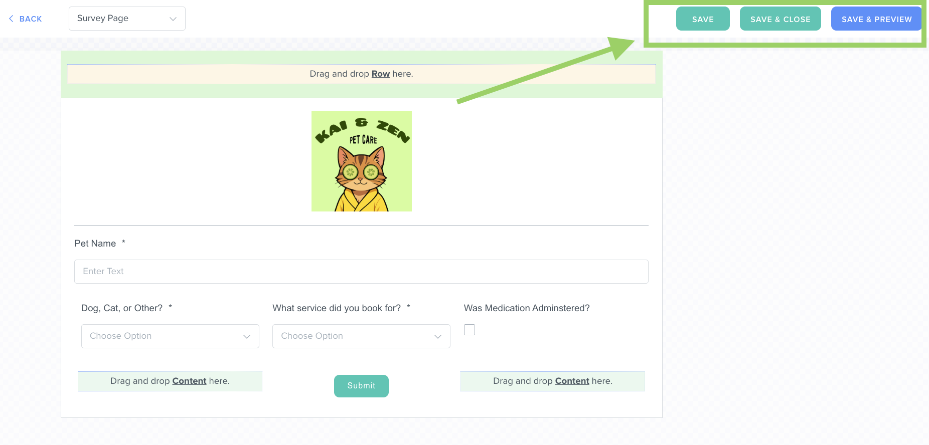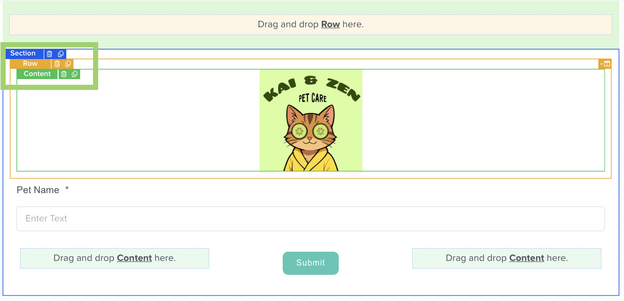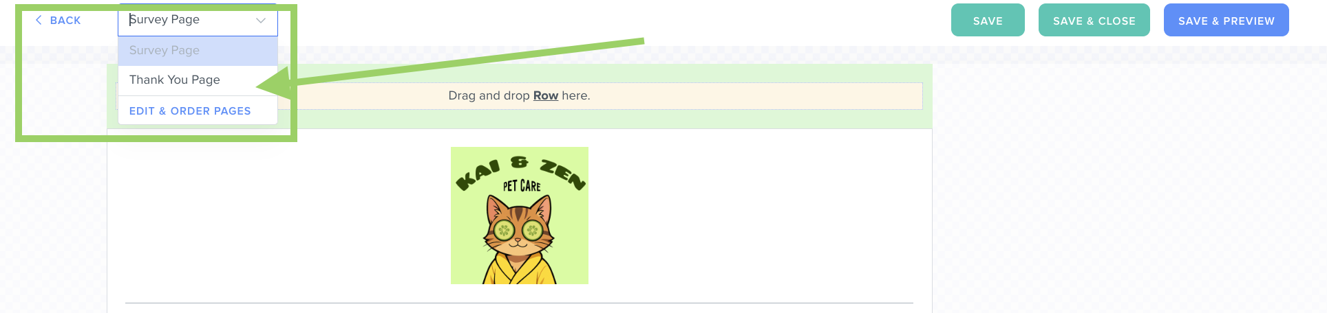 Here, you can customize the page using the same steps you used to create your survey: drag and drop sections, rows, and content blocks to fit your needs.