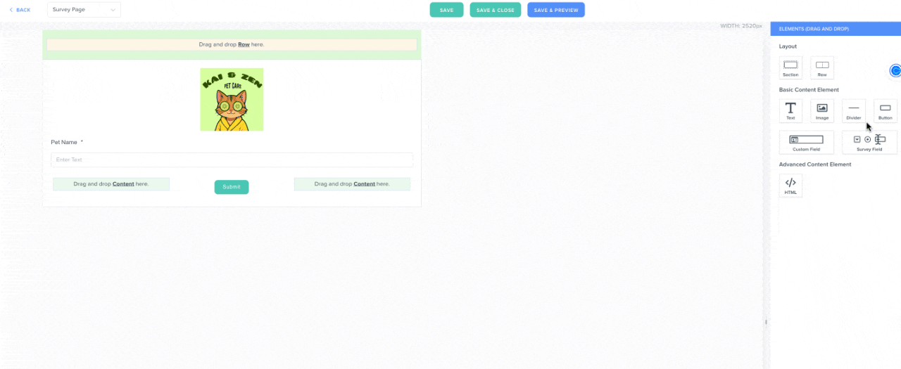 - To continue creating your survey, you can drag and drop content elements from the same menu section. You can use them to add buttons, text, images, or even just a line divider to provide clearer separation between content rows, as seen in the GIF below: