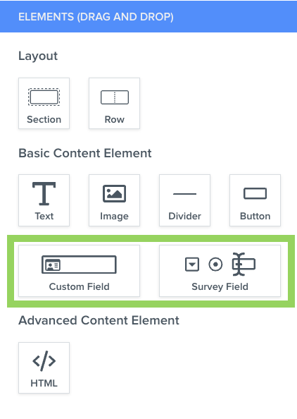 - Survey Field: This content block allows you to add standard inputs like email addresses, multiple-choice options, file uploads, and more. This will not change any values on the object record and is useful if you want the survey submission data to be independent of the object record.