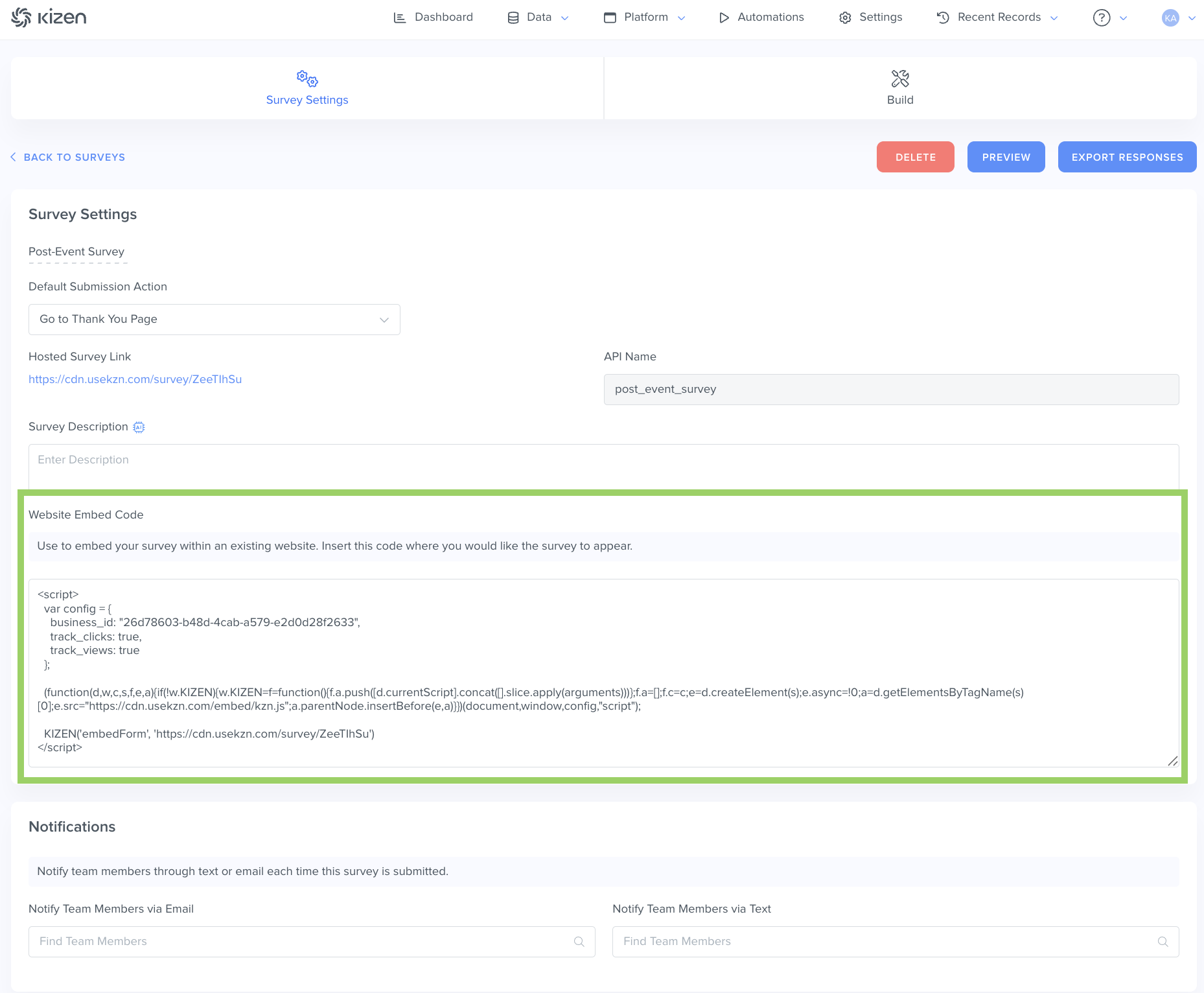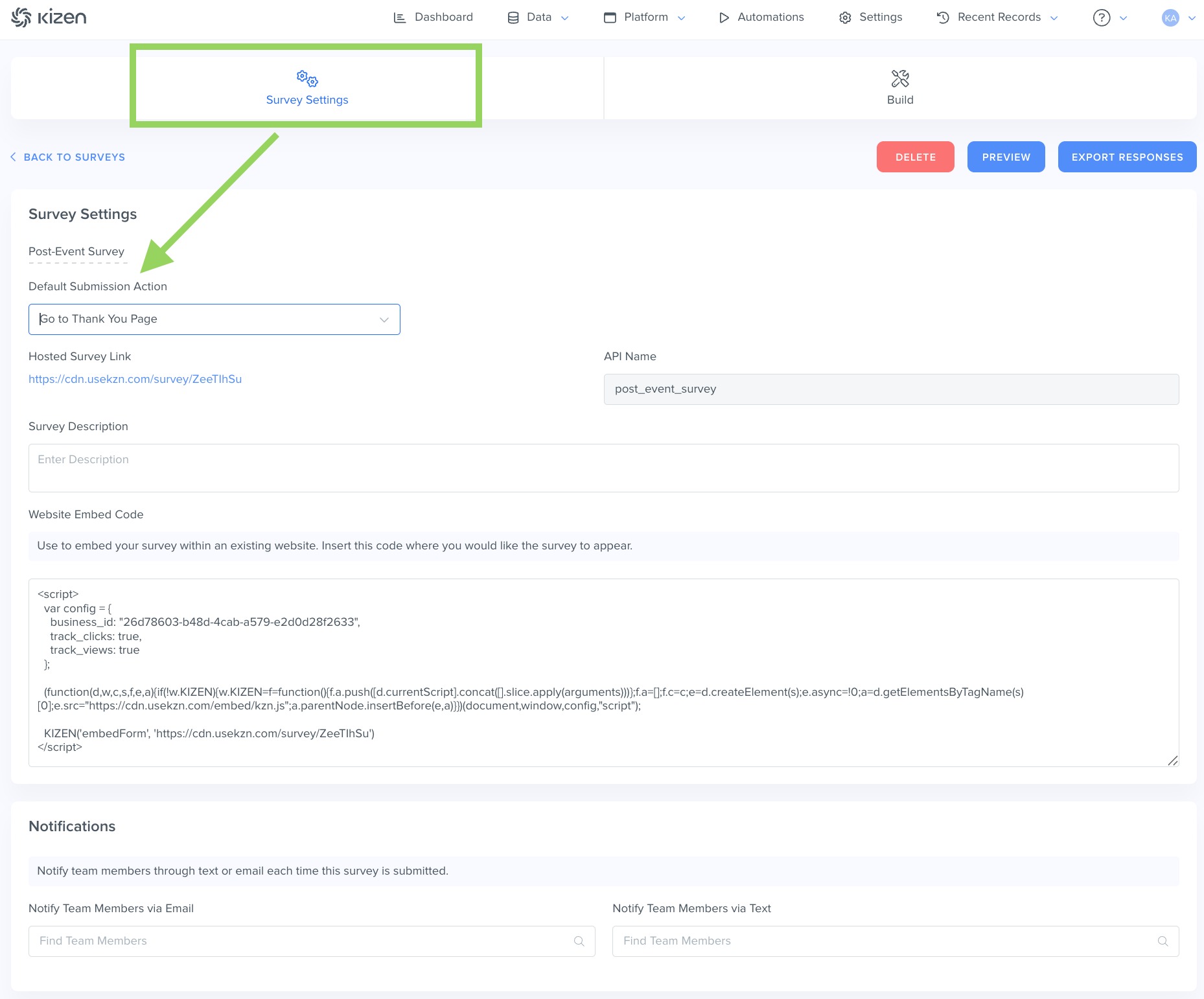 Once you have created your surveys, Kizen offers you several options for the next steps. You can customize the post-submission page, set up notifications to alert specific team members, or build automations to kick off workflows based on survey results.