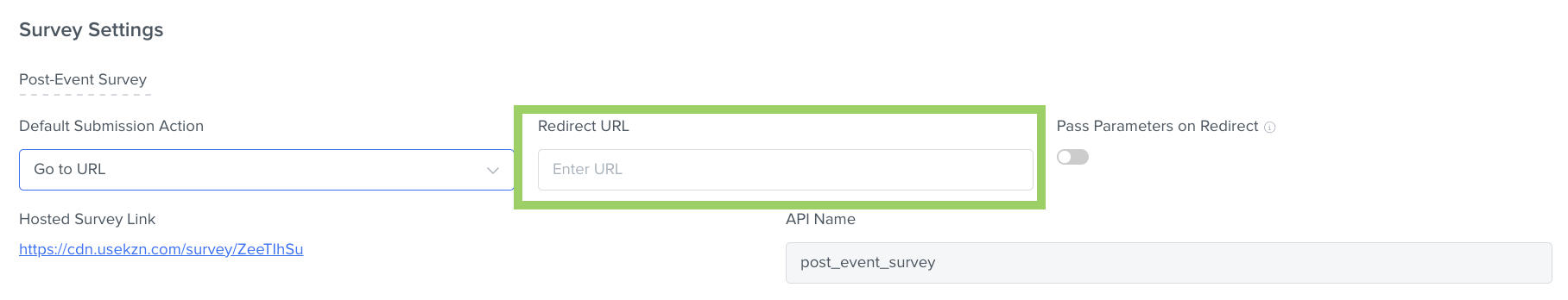 - If you select "Go to URL", to automatically send the survey submitter to a different webpage. Enter the specific URL of that webpage in the “Redirect URL” field.