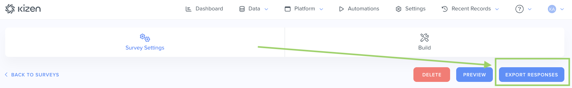 To export responses, go to your Survey. Within the Survey settings, select "Export Responses" in the upper right-hand corner: