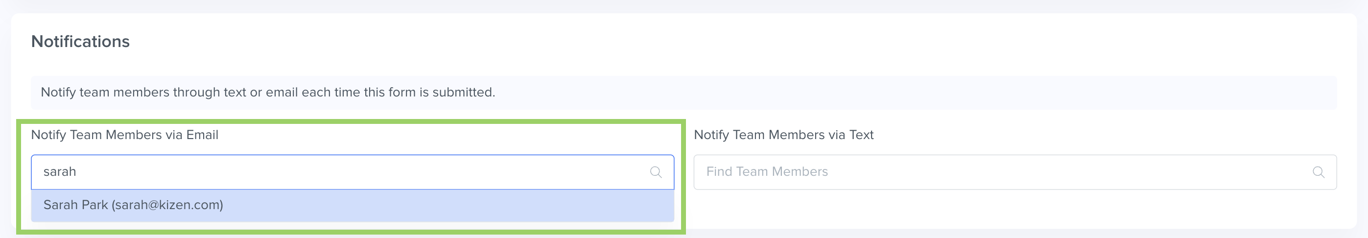 To send an alert to a role level or individual from your team, select the "Survey Settings" tab and scroll down to "Notifications." Then, select your preferred notification method--it can be email or text--and then choose which team member will receive these notifications.
