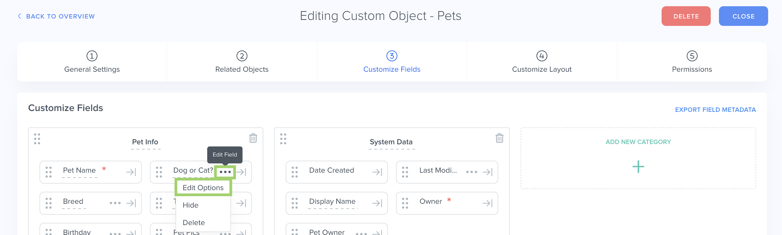 - Select the "..." menu to the right of the field name > "Edit Options":