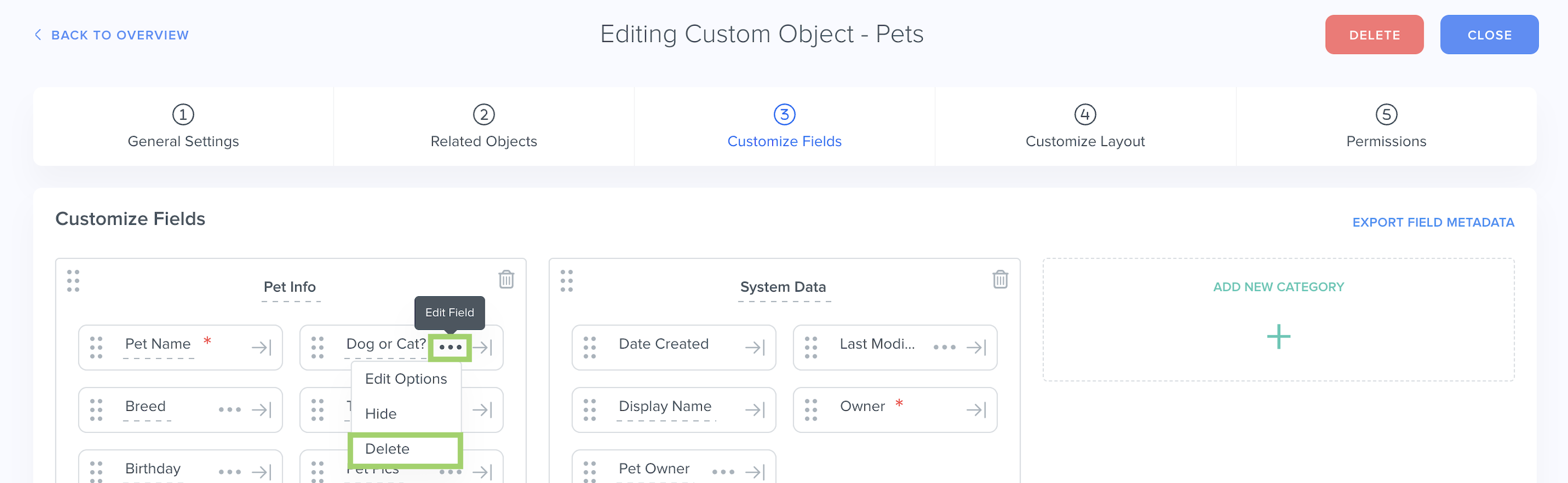 - To delete a Custom Field, select the "..." menu to the right of the field name > "Delete":