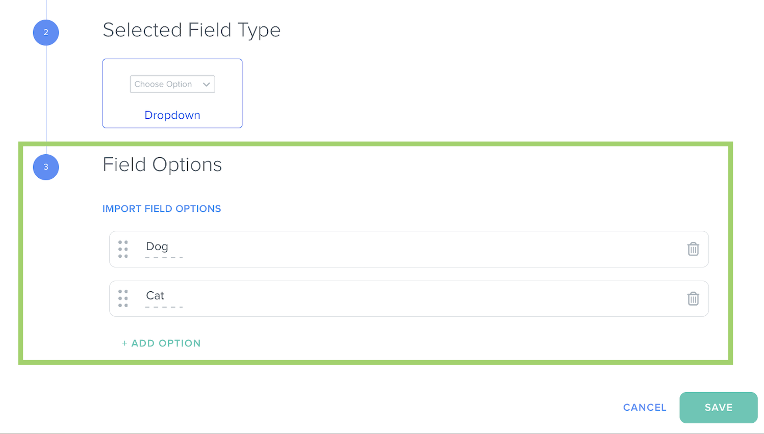 (As mentioned above, we recommend keeping the Field API Name as is for fields that came pre-configured in your Kizen account. However, if you would like to edit the API name for your Custom Field that you created yourself, you can certainly do so and refer to our API documentation for additional guidance.) - To edit existing field configuration, such as Dropdown field values, scroll down to the "Field Options" section. You can click on the trash bin icon to delete field options or click on "Add Option" to add more field options.