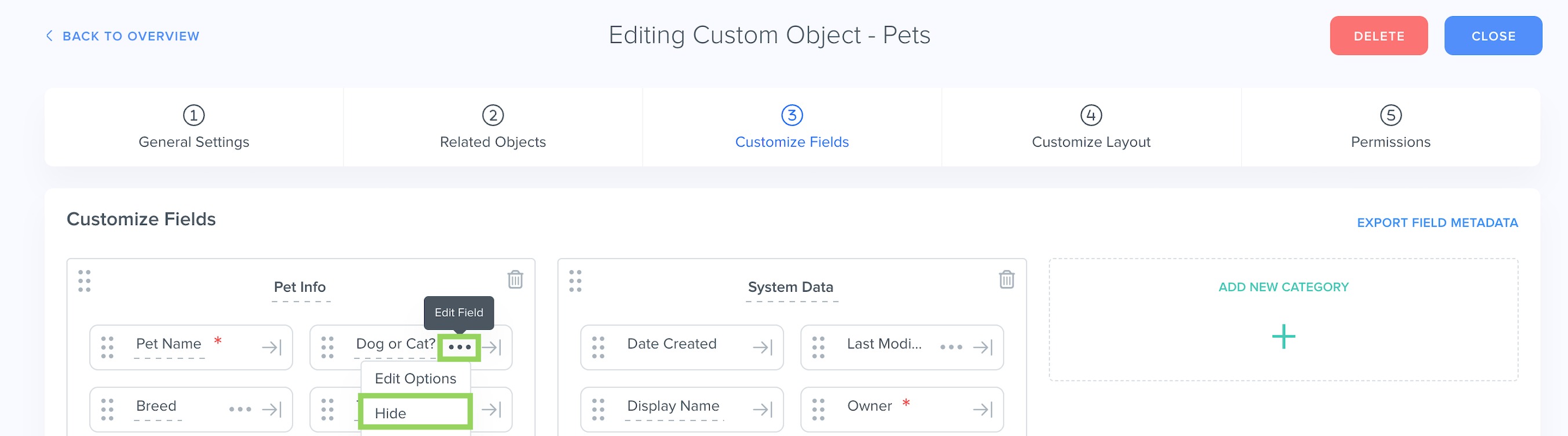 - To hide a Custom Field, select the "..." menu to the right of the field name > "Hide":